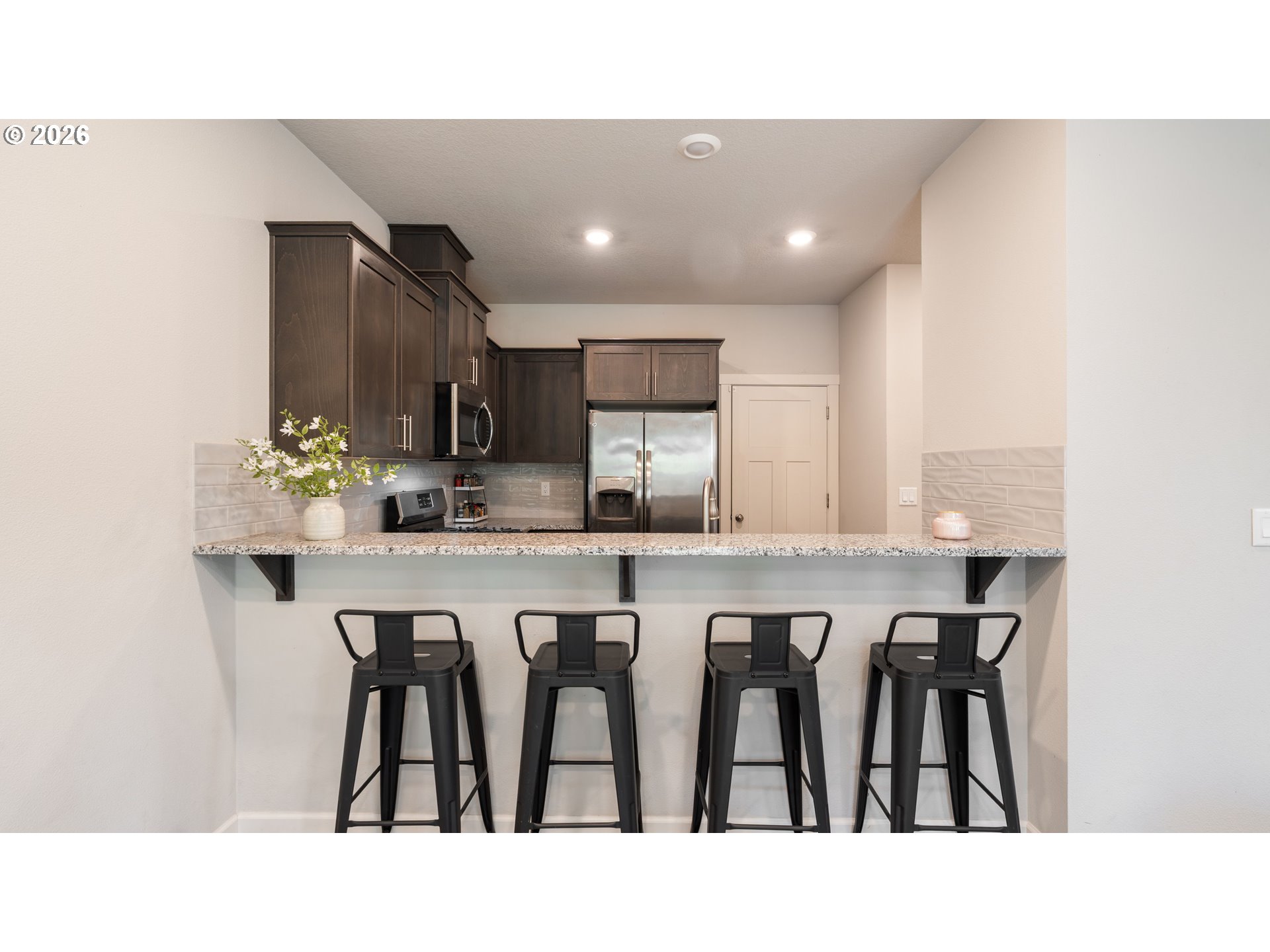 - Like-new townhome in the highly sought after gated community of Cloverhill! This former model home showcases numerous upgrades and an exceptional open-concept floor plan designed for modern living. The main level features stylish laminate flooring, a spacious living room with a cozy gas fireplace, and an inviting dining area. The open kitchen is beautifully appointed with granite countertops, stainless steel appliances, a pantry, and a convenient eating bar perfect for everyday living and entertaining. A main-level half bathroom adds extra convenience. Upstairs, the expansive primary suite offers a striking decorative accent wall and a luxurious en-suite bathroom with dual sinks, tiled countertops, a walk-in shower, and a generous walk-in closet. Two additional bedrooms and a convenient laundry room complete the upper level. Enjoy outdoor living on the covered patio overlooking a private fenced backyard that backs to peaceful greenspace. Additional features include front and backyard sprinkler systems, smart home technology, and a spacious two-car garage. The HOA provides exceptional value by maintaining the roof, gutters, siding, exterior paint, front landscaping and irrigation, entry gate, and common areas including 31 overflow parking spaces. This desirable community is surrounded by scenic walking trails and a beautiful tree-lined greenbelt. Conveniently located just minutes from shopping, dining, and everyday essentials, including Rosauers, Costco, Starbucks, and more. The area also offers outstanding recreation and entertainment options, including local wineries, the nearby wildlife refuge, and kayaking opportunities on Lake River. Come tour this exceptional home today and discover why it’s the perfect place to call your own!