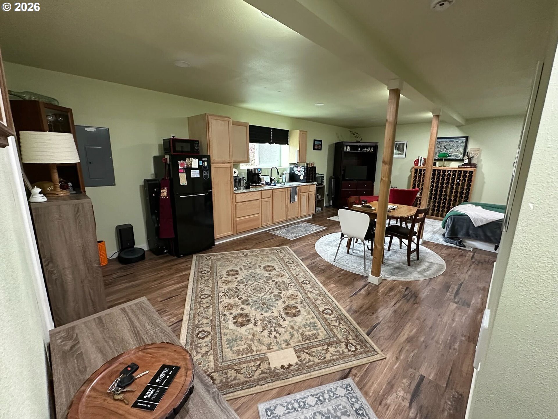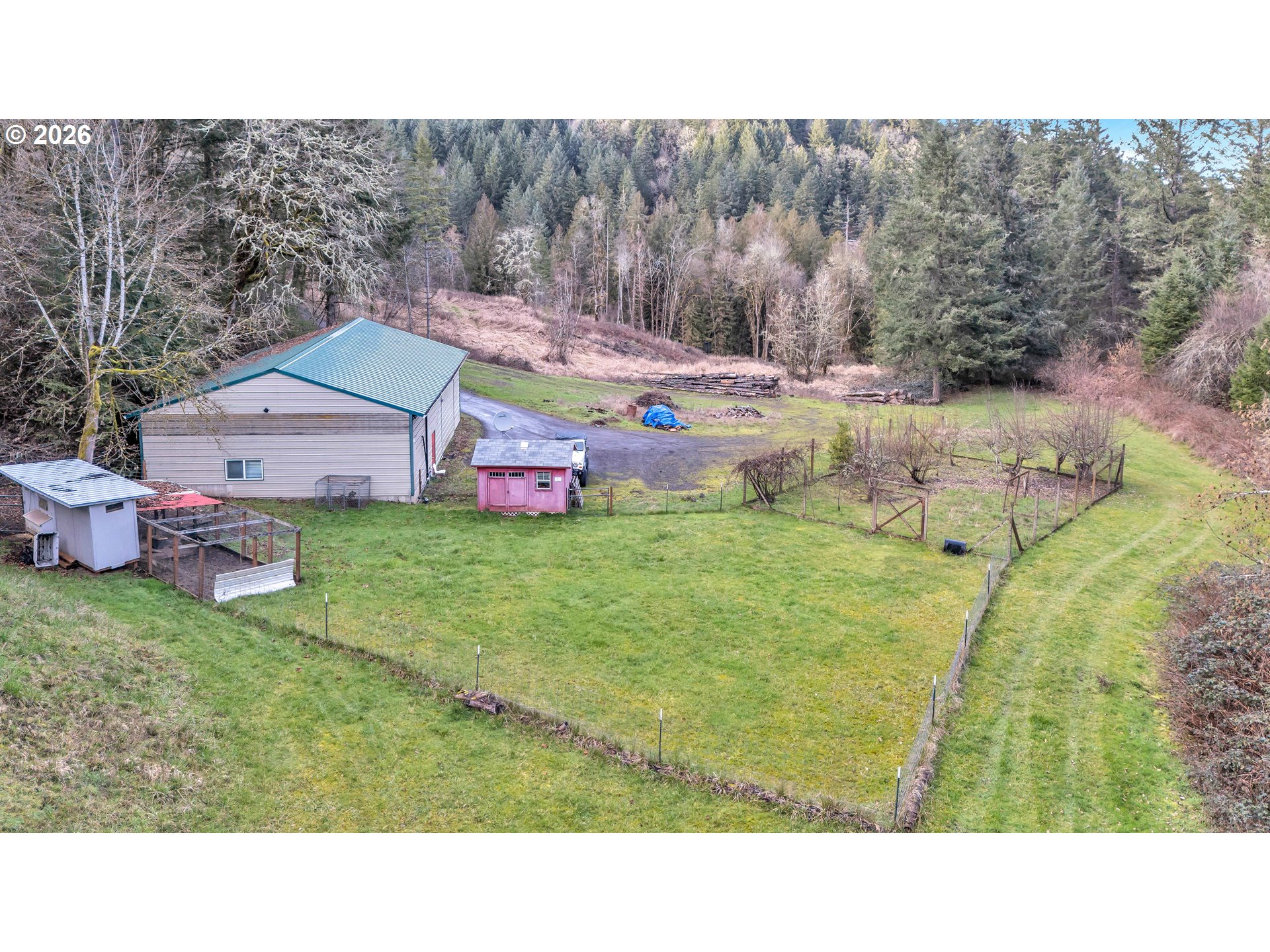 - Country living at its best! This beautiful home sits on 9 private acres surrounded by forest, wildlife, and serene natural beauty, complete with a pond, garden area, mature fruit trees, chicken coop, and in-ground sprinkler system. A gravel driveway welcomes you into this peaceful retreat.The main level features an expansive open floor plan with hardwood floors, vaulted ceilings, and abundant natural light. The spacious living, kitchen, and dining areas flow seamlessly together, each with updated Andersen sliding doors leading to the wraparound deck. Enjoy tranquil views of the grounds and unwind in the hot tub, creating the perfect indoor-outdoor lifestyle. The generously sized kitchen offers stainless steel appliances, a gas stove, island with eat bar, and ample space for gatherings and everyday living.Three bedrooms are located on the main level, all with wall-to-wall carpet, including the primary suite with a walk-in closet, ensuite bath, ceiling fan, and private deck access. The home offers a total of 2.5 baths, with 1.5 baths on the main level and a full bath on the lower level.Downstairs provides incredible flexibility with a large family room featuring a cozy wood stove and kitchenette, a fourth bedroom, and an additional bonus room ideal for a bedroom, office, gym, or hobby space. Sliding doors open to the enormous backyard, making this level perfect for multigenerational living or extended guest stays.Major updates include new windows (approximately 4 years old), a roof (4 years old), leaf guard gutters, and an efficient heat pump with A/C for year-round comfort.The property also features a detached 40' x 50' shop with power, water, heat, and two 12-foot doors, plus RV and boat storage. The ADU is located within the shop while preserving full shop functionality for everyday use.With expansive grounds, peaceful surroundings, and endless possibilities, this one-of-a-kind property offers privacy, versatility, and the true charm of country living.