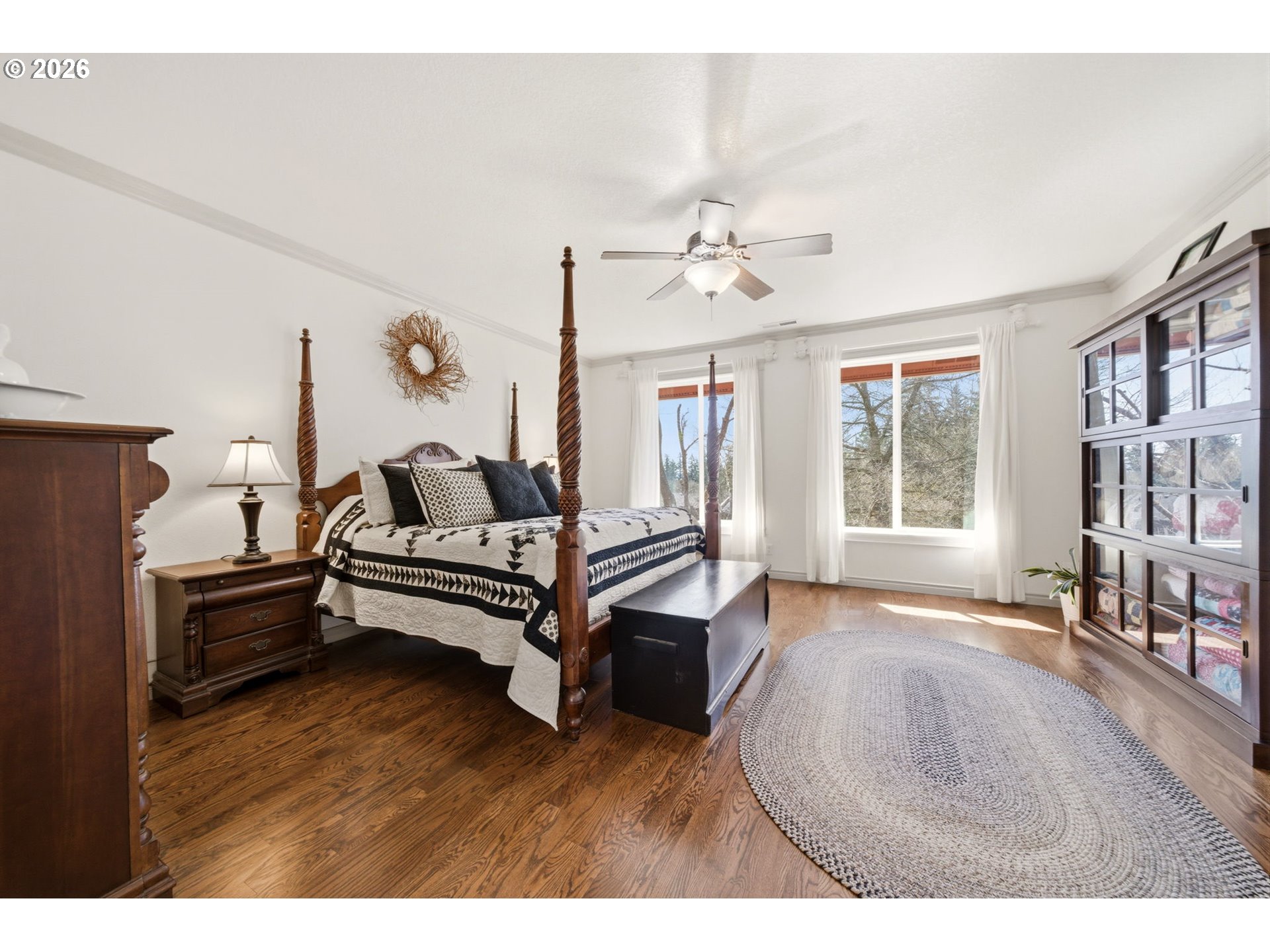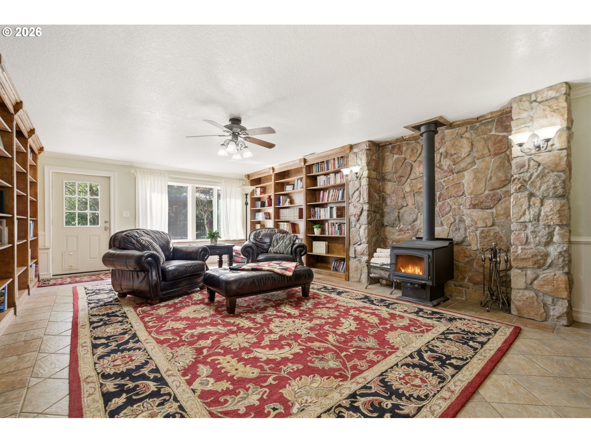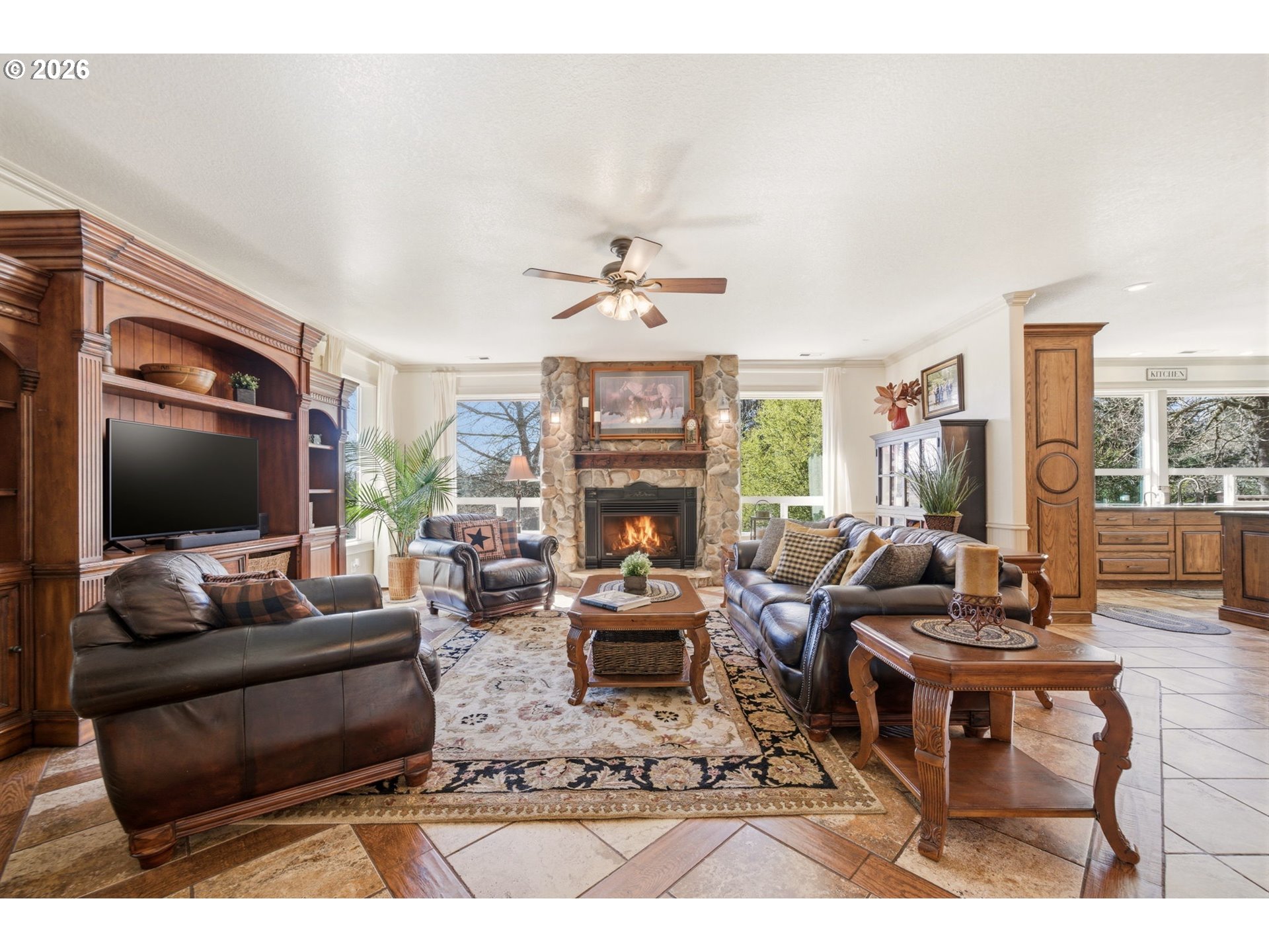 - This timeless New England–style Colonial offers refined country living just minutes from downtown Camas, set on over two private, park-like acres directly across from Lacamas Park with immediate access to miles of scenic trails. A striking two-tier waterfall sets the tone as you approach the entrance, welcoming you into beautifully landscaped grounds with year-round color and natural privacy. Spanning more than 4,600 square feet, this custom-built home features an open, light-filled layout with hardwood and tile flooring, extensive custom woodwork, and spaces designed for both everyday living and entertaining. The gourmet kitchen includes a Sub-Zero refrigerator, Wolf range, double Dacor ovens, granite countertops, large island, and picture window overlooking the landscaped grounds. The main level features a primary bedroom and dedicated home office, along with multiple living areas and formal and casual dining spaces. The lower level includes four additional bedrooms, a library with built-ins, and abundant storage. Built for comfort and efficiency with a new Trane heat pump, 98% efficient Lennox furnace, central A/C (2026), R60 insulation, and earthquake-resistant construction. Outdoor living is effortless with multiple spaces for gathering, including a detached deck with gazebo, attached rear deck, built-in barbecue, and brick firepit. For those seeking a self-sustaining lifestyle, the property offers a mature orchard and garden area featuring grapes, raspberries, boysenberries, blueberries, and strawberries, along with a chicken coop and run and a fenced pasture—ideal for a mini farm or homestead. Additional highlights include an attached 2.5-car garage and detached 2-car garage/shop, along with a matching shed, offering ample space for storage, hobbies, and equipment, all combining timeless craftsmanship, modern amenities, and peaceful surroundings.