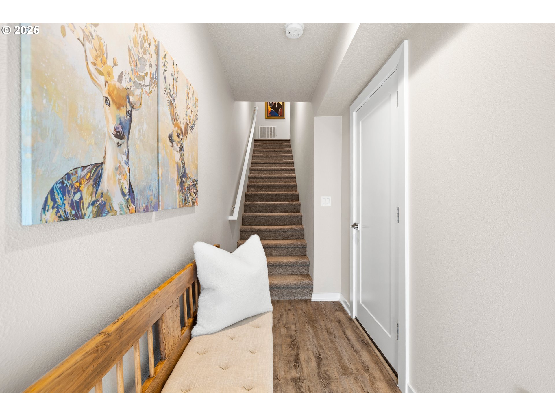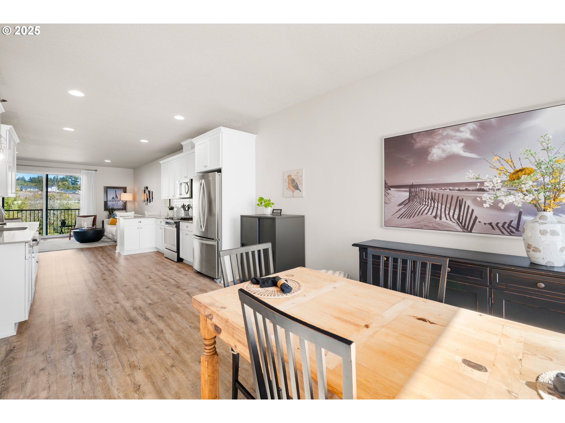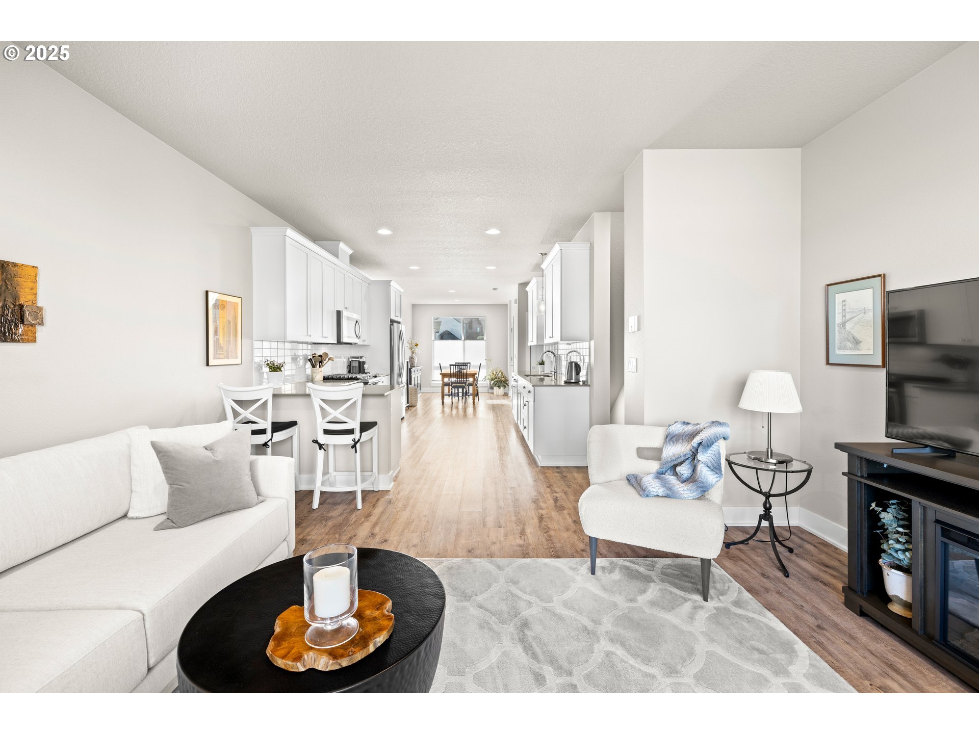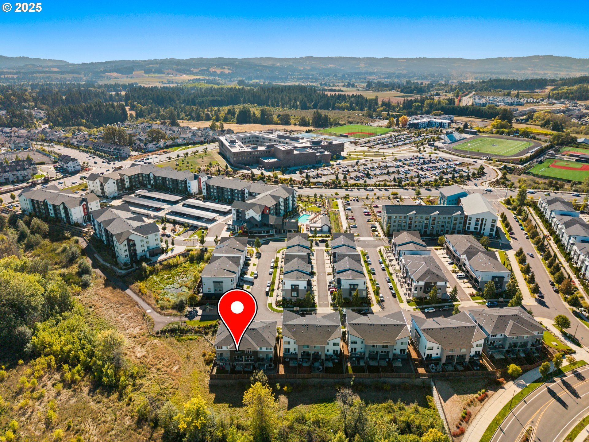 - Best Location in the complex + Privacy + yard + 2-car-garage. Experience luxury living in this stunning townhouse, set in a peaceful, private location that backs to greenspace—perfect for nature lovers. Enjoy nearby walking trails while still being close to everyday conveniences. Built by West Hills Homes, a high-performance builder known for energy efficiency, this one-owner residence reflects pride of ownership and exceptional care. With its southwest exposure, the home enjoys soft morning light in back and warm afternoon sun in front. The living area overlooks the greenery and features luxury vinyl flooring that flows into the thoughtfully designed kitchen with quartz countertops, Whirlpool Gold Series appliances, white soft-close cabinetry, a peninsula bar, and a spacious pantry. The owner’s suite, filled with morning light, offers a walk-in closet and private bath w/dual sinks and quartz countertops. A large second bedroom works well as a guest room or office, with laundry conveniently placed between both bedrooms. The expansive 2-car tandem garage includes direct access to the fenced yard and patio, EV-outlet, and a WiFi-enabled opener. A private composite deck with metal railing overlooks the greenspace for seamless indoor-outdoor living. Additional features include modern colors, top-down/bottom-up shades, ceiling-fan rated junction boxes, and a zoned ducted heat pump for year-round comfort. Near Progress Ridge and Murrayhill, this home offers easy access to shops, dining, and entertainment, plus top-rated schools—Scholls Heights Elementary, Conestoga Middle, and Mountainside High.
