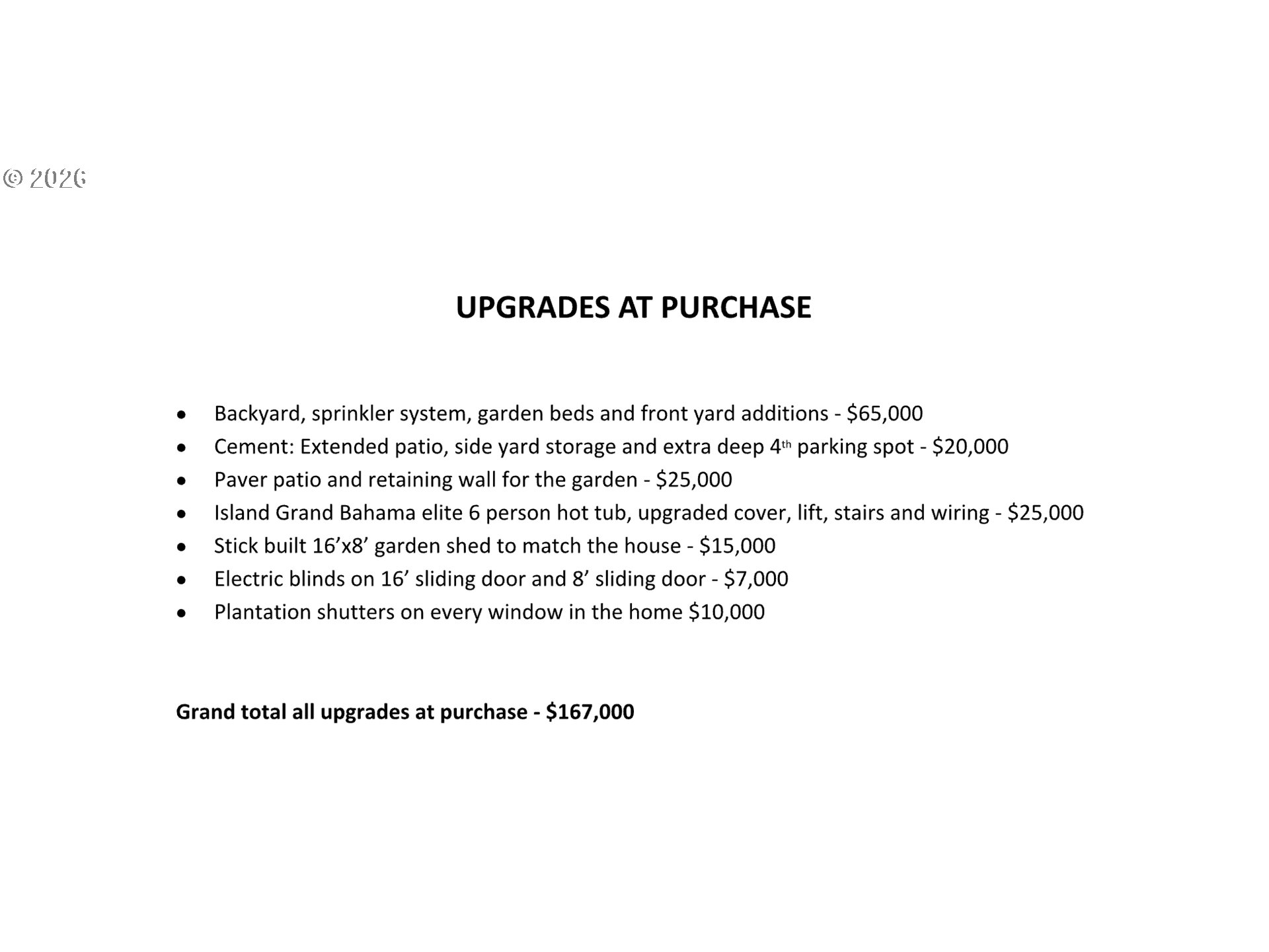 - Covered Patio, Fenced, Free-Standing Hot Tub, Gas Hookup, Raised Beds, Security Lights, Sprinkler, Tool Shed, Yard
