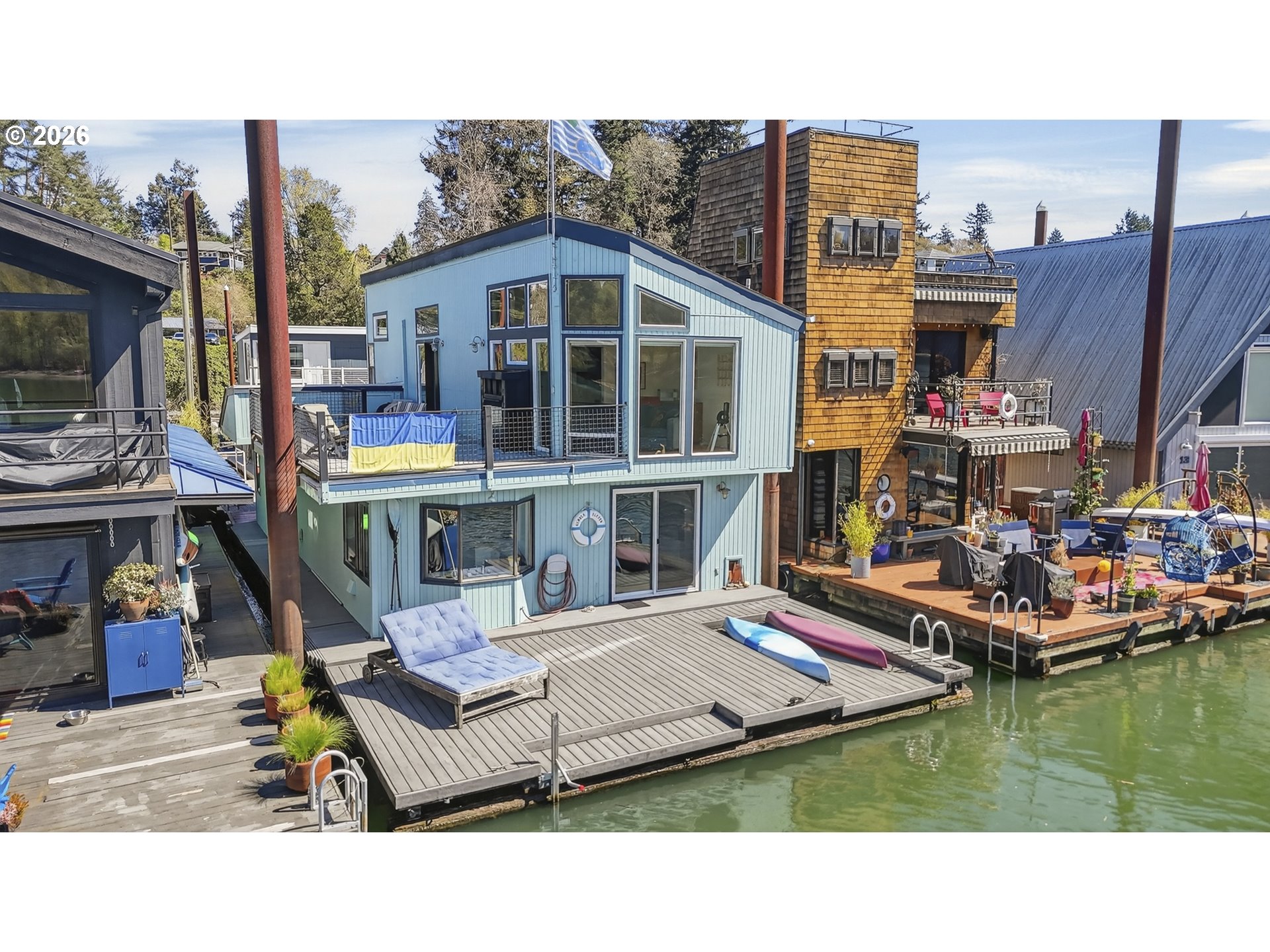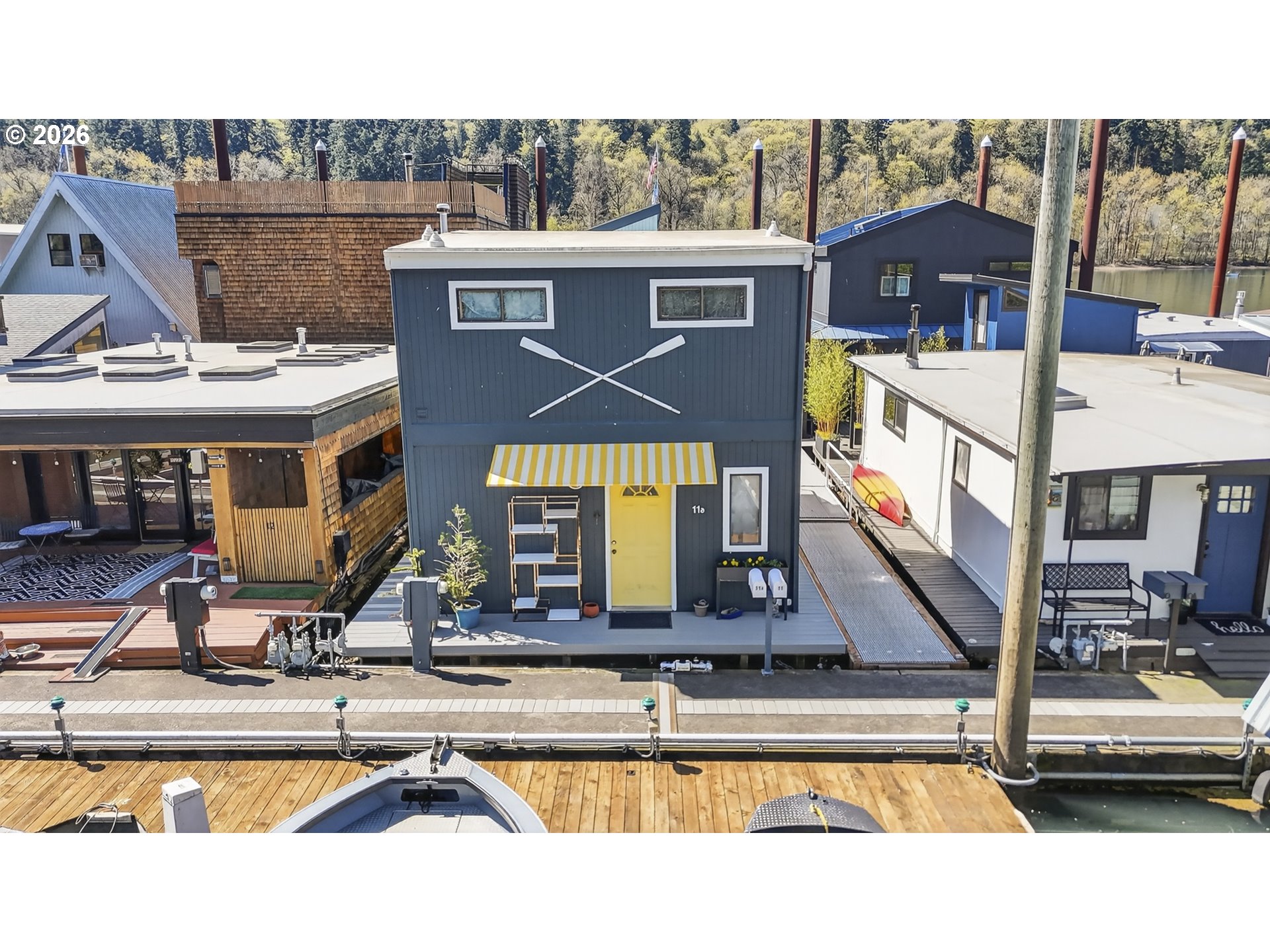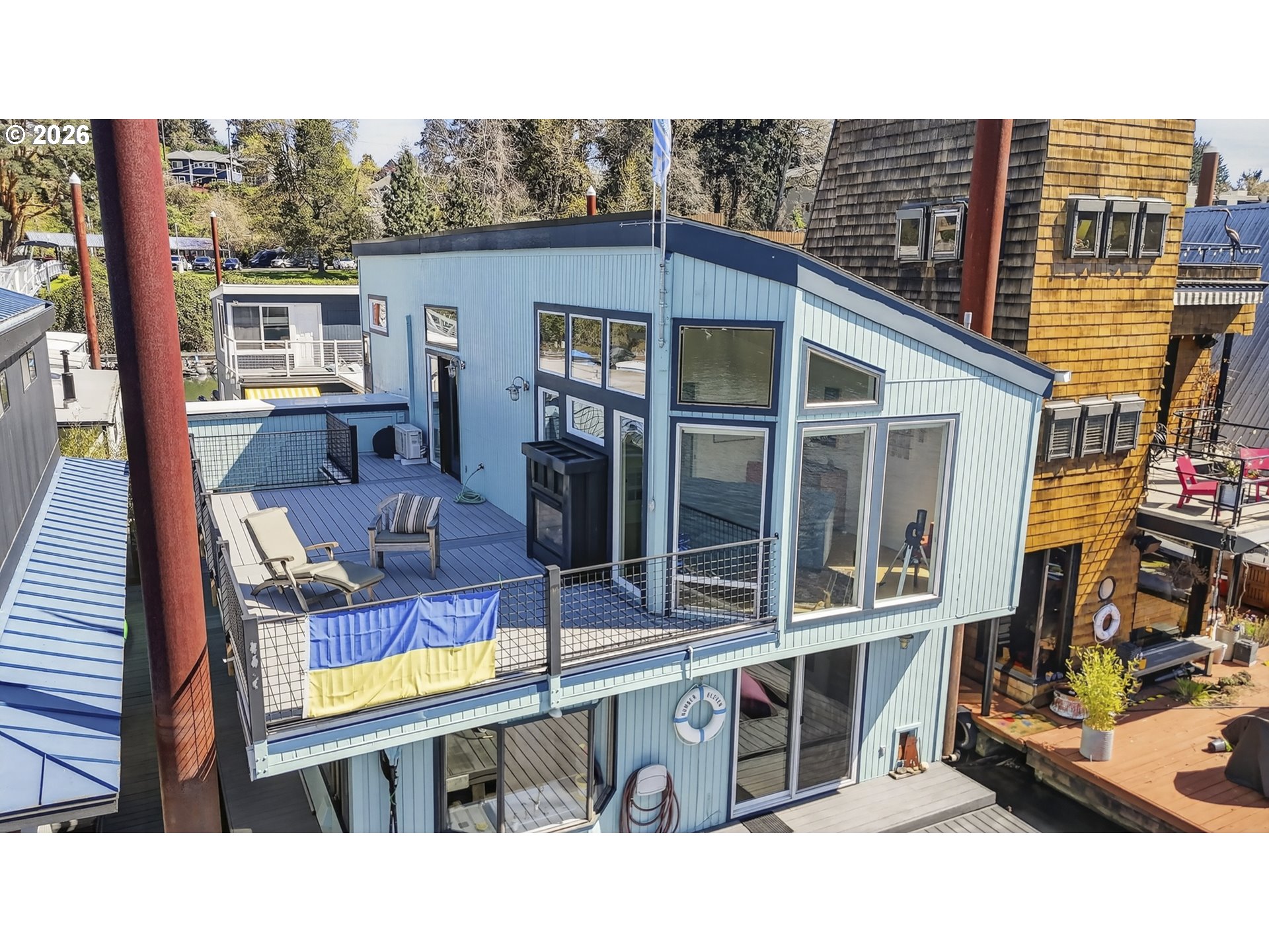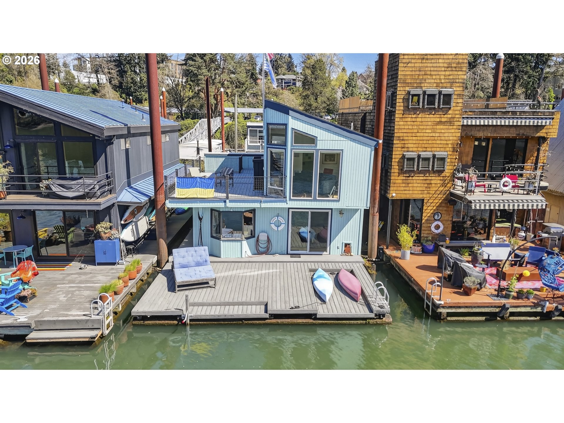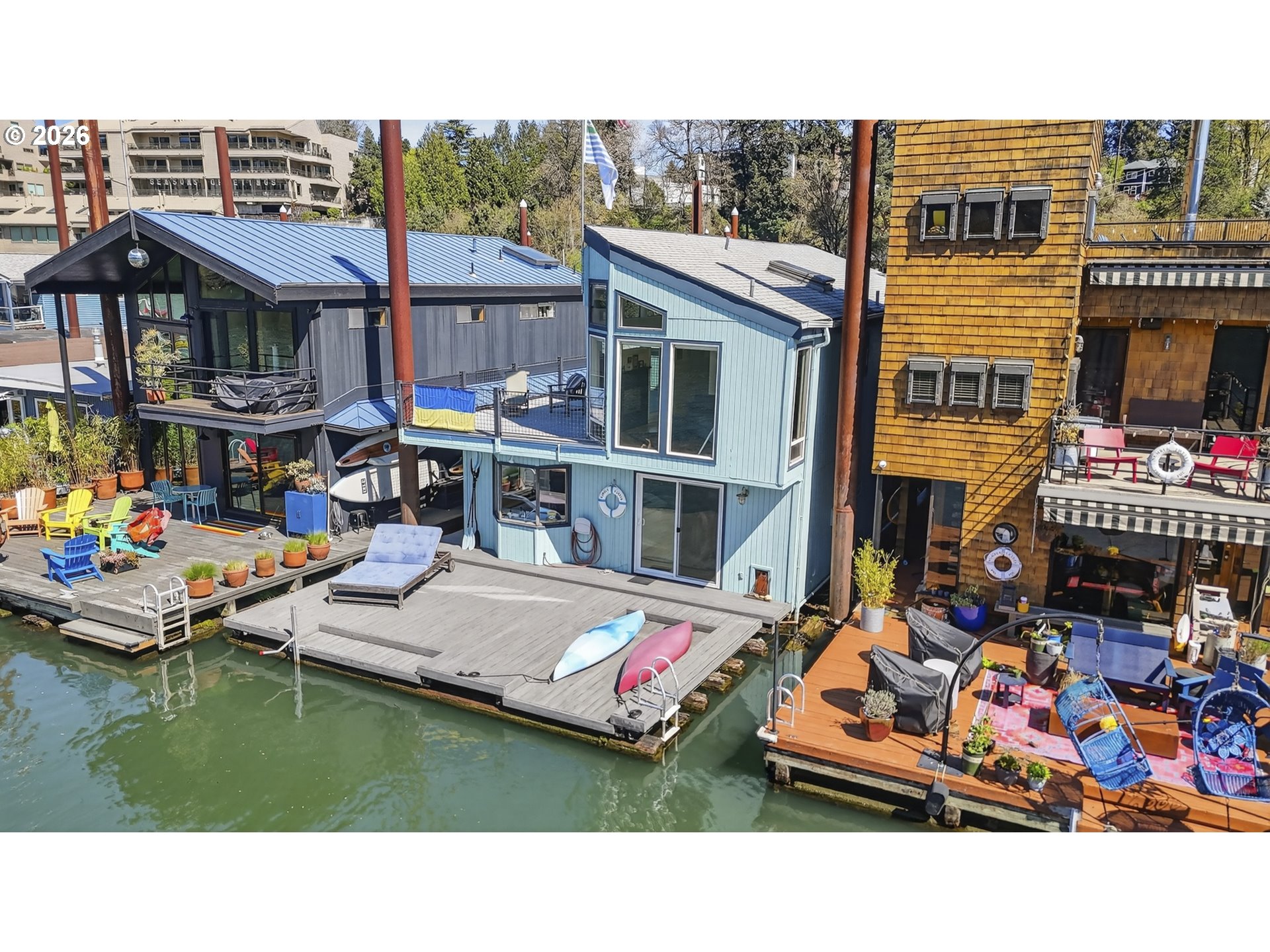 - Tucked along a picturesque stretch of the Willamette River at the historic Portland Rowing Club, this one-of-a-kind floating property delivers the full river lifestyle—complete with three separate floating structures: a beautifully updated main home, a charming ADU tender, & a separate storage shed. The main home features 2 bedrooms & 2 bathrooms, blending comfort with a relaxed coastal feel. The main level showcases wood flooring and a tongue & groove wood ceiling, creating a warm, inviting space. The sunken kitchen is a standout feature, with a charming bay window that frames river views & a gas cooktop that makes cooking a joy. The living room offers recessed lighting, a gas fireplace, & sliding doors that open to the main deck — perfect for taking in the fresh air & scenic views. Upstairs, vaulted ceilings elevate the space, where a light-filled primary bedroom takes center stage. Large windows showcase sweeping river views, while an indoor/outdoor gas fireplace adds a touch of magic year-round. A wet bar and built ins are tucked into the hallway for easy access! Also on the upper level; 3rd bedroom with a mini split & closet, a full bathroom, & access to the upper deck — an ideal spot to unwind, entertain, & take in the ever-changing scenery of the Willamette River. The outdoor spaces are dialed in for river living, with plenty of room to host, a kayak ramp, & a step-down for easy water access. Storage is abundant throughout, & the separate storage structure (complete with electricity) adds even more flexibility. The ADU tender is a true bonus, offering its own kitchen, living area, & bathroom on the main level, plus a loft-style bedroom & upper deck with views of the River! Whether used for guests or rental income, it’s a rare & valuable addition. Located next to Springwater Trail & just a few short blocks from Sellwood proper, this home offers not just a place to live — but a lifestyle rooted in community, nature, & the timeless charm of life on the river.
