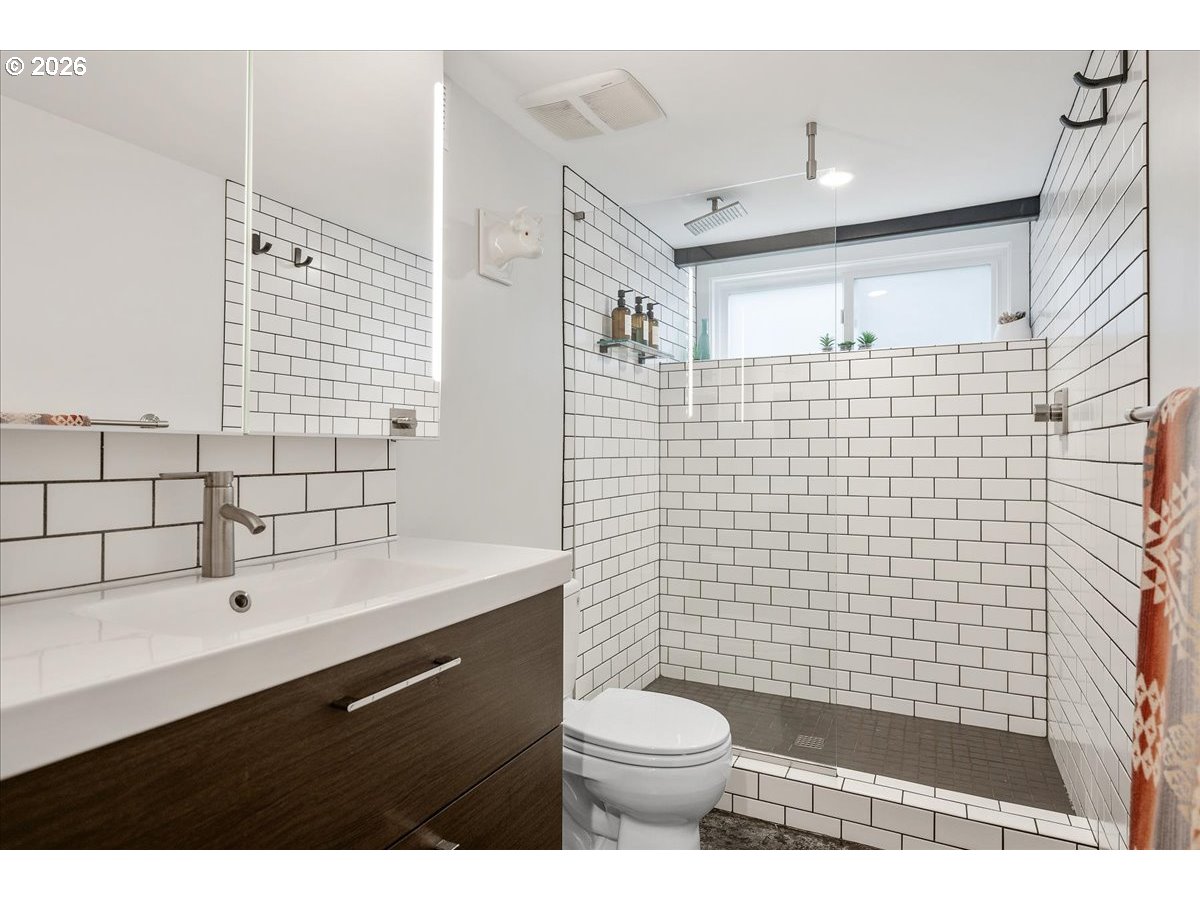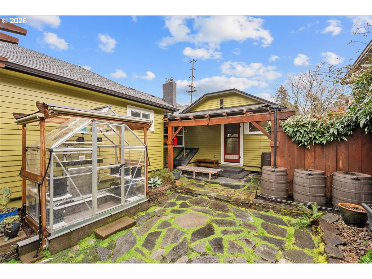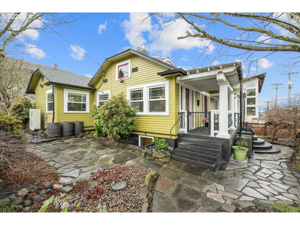- This Lovingly Mt. Tabor home has been transformed over the past two decades, the home blends timeless character with modern comfort and thoughtful sustainability. Bathed in natural light from abundant windows — including an entire front wall of glass — the interior feels bright, open, and welcoming, with an easy connection to the outdoors. The updated kitchen features quartz countertops, upgraded appliances, charming mid-century cabinetry, and a delightful east-facing breakfast nook — perfect for morning coffee. A cute, convenient main-level half bath sits between the kitchen and private backyard, enhancing seamless indoor-outdoor living. Designer flooring, refreshed fireplace tile, fresh paint, and updated lighting elevate the main level. The second bedroom features glass French doors making it a lovely bedroom or a bright home office. The primary suite offers a peaceful retreat with an updated bath, walk-in closet, and tropical hardwood deck. The flexible lower level includes 1 bedroom, family/living room, kitchenette, dining area, laundry, and an awesome bathroom — ideal for guests, extended living, or income potential. Outside, thoughtfully designed landscaping creates a private sanctuary with raised beds, rock walls, flagstone pathways, pergola, and automated greenhouse — supported by comprehensive drainage and rainwater systems. Extensive system upgrades — including roof, siding, plumbing, electrical, windows, high-efficiency heating and cooling, sump pump with backup, earthquake shutoff valve, and smart features — provide lasting confidence. All of this character and peace of mind just minutes from Mt. Tabor Park, neighborhood restaurants, and local shops! [Home Energy Score = 5. HES Report at https://rpt.greenbuildingregistry.com/hes/OR10244702]