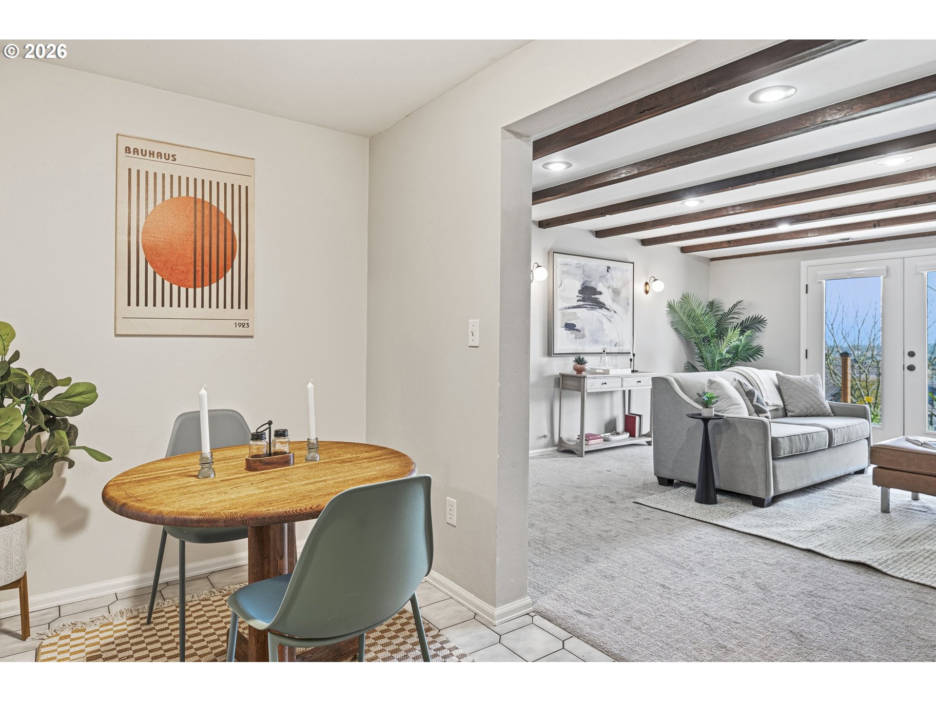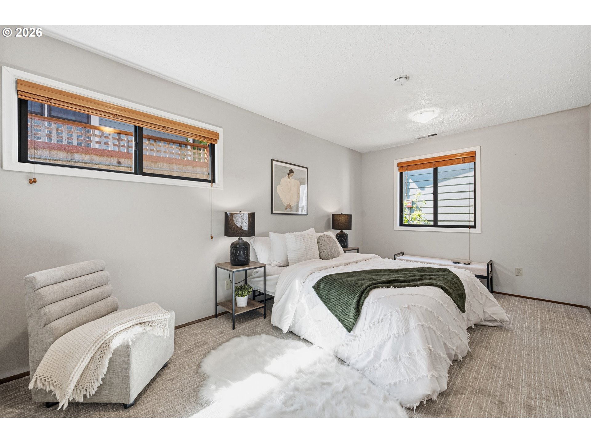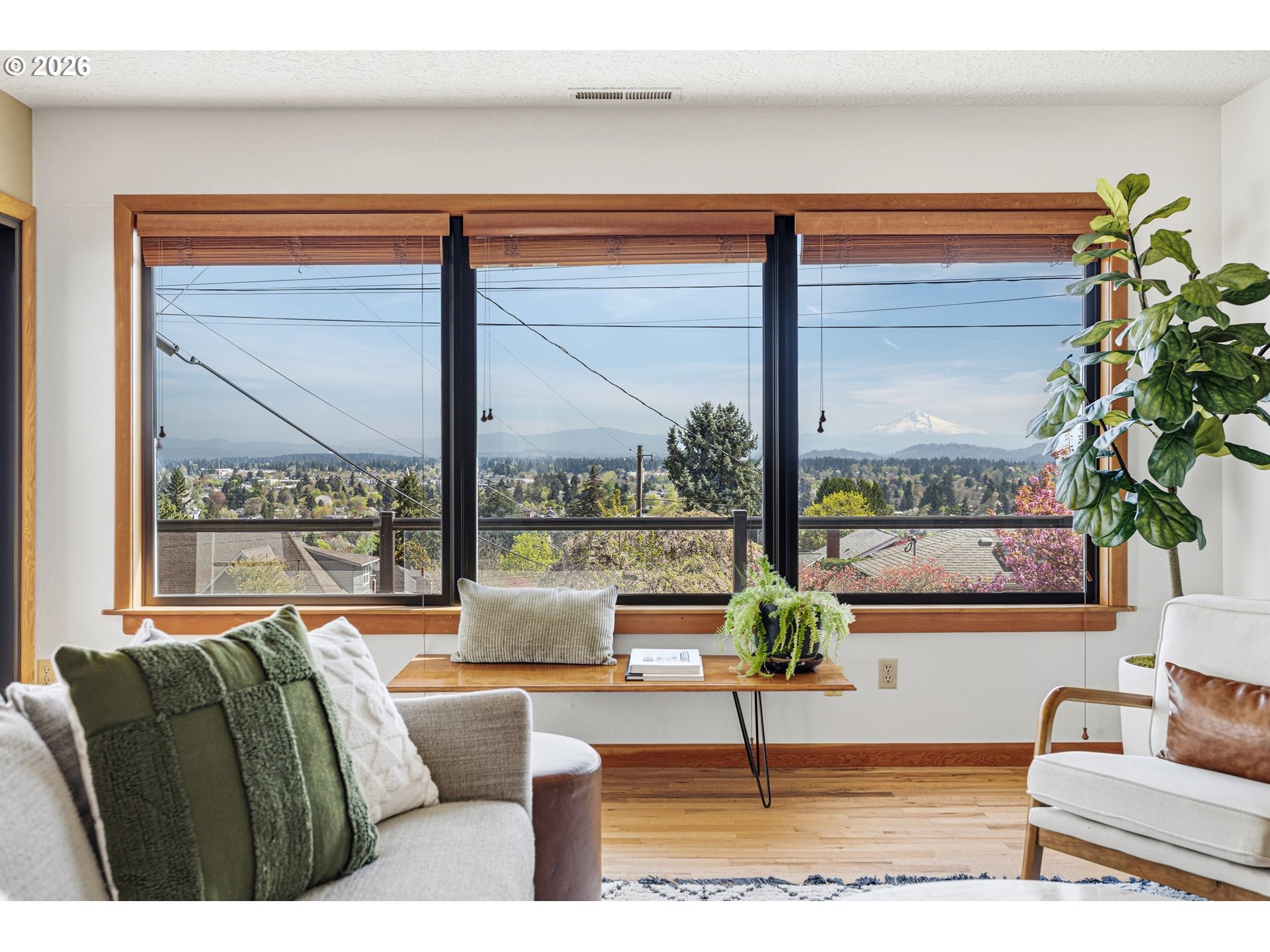 - Stunning Mid-Century Modern perched high on Mt. Tabor with views for days — Mt. Hood, Mt. St. Helens, Prune Hill, and beyond, all visible from the living room, office, primary bedroom, & covered deck. Your morning run (walk, stroll, roll) to the Mt. Tabor summit starts one house away. Open floor plan with gas fireplaces, and a primary on main complete with en suite bathroom. Refreshed kitchen with updated appliances, newer windows, siding, solar panels, and electric water heater. Single-car tuck-under garage, plus a spacious 2+ car detached garage with direct back entry. Daylight basement apartment features its own gas fireplace, French doors, and garden views. Fruitful raspberries along south side of property. Steps to Mt. Tabor Park, Coquine, Montavilla shops and restaurants, transit, and PDX. [Home Energy Score = 4. HES Report at https://rpt.greenbuildingregistry.com/hes/OR10000447]