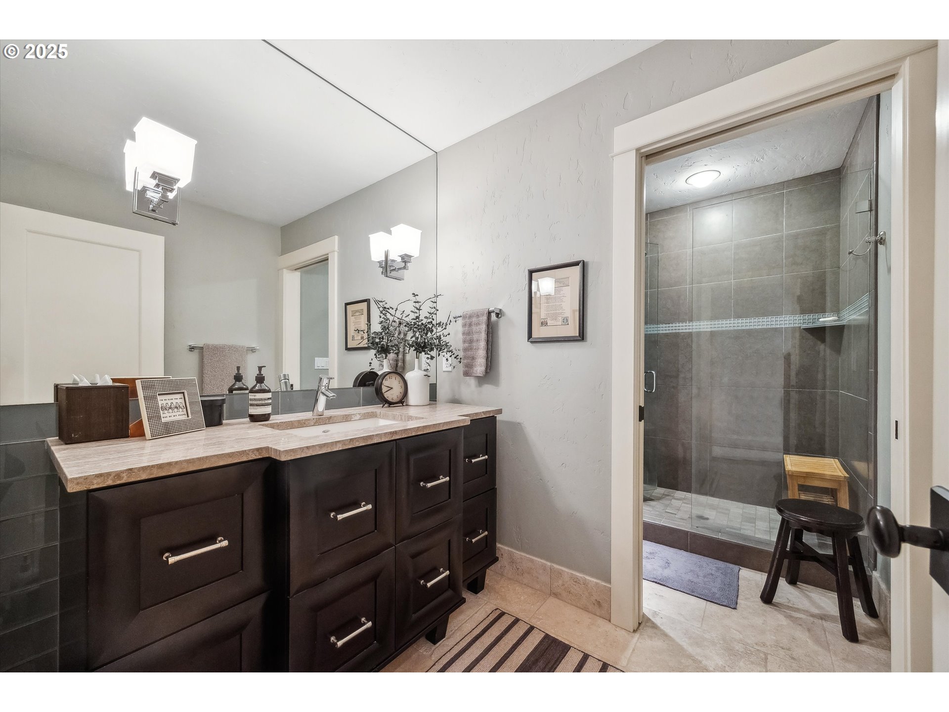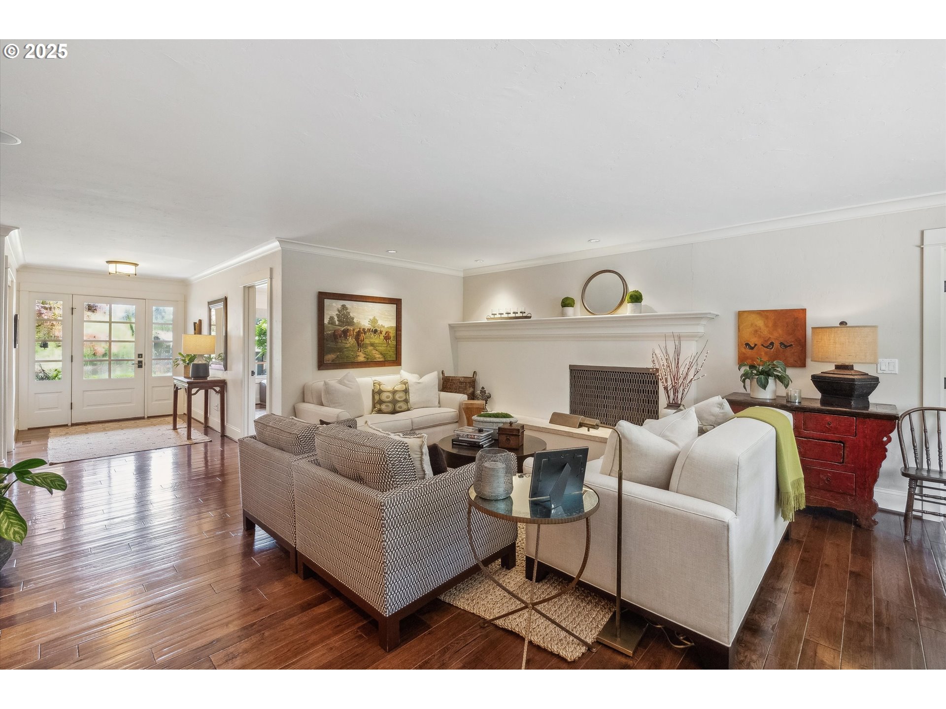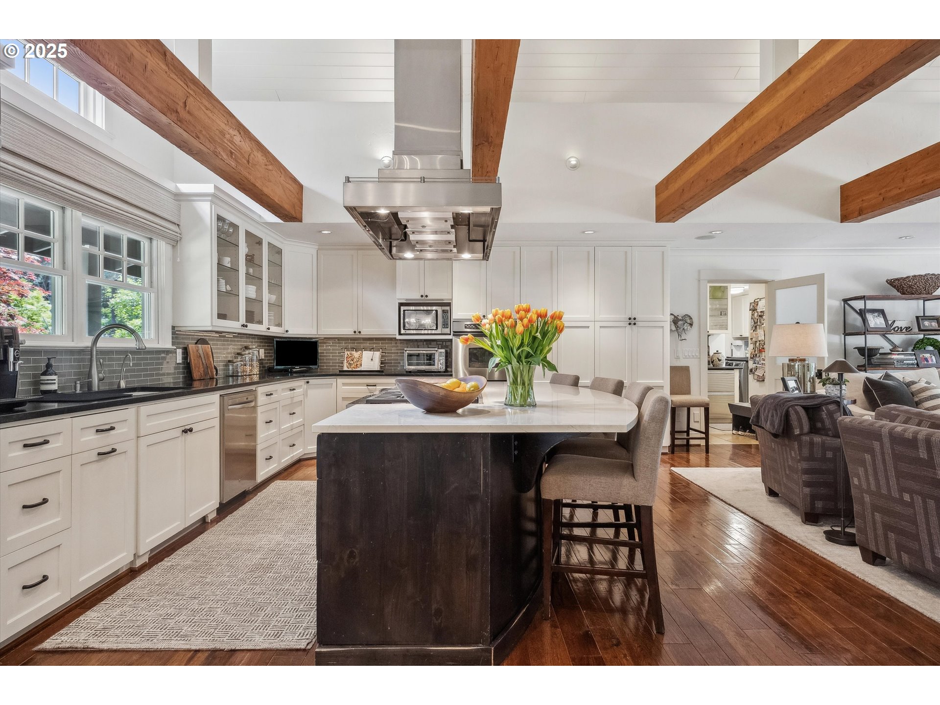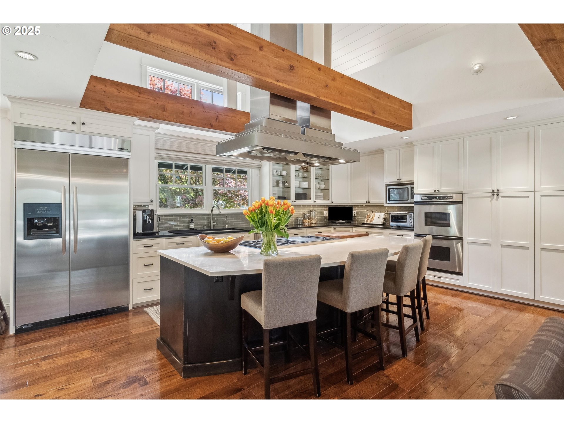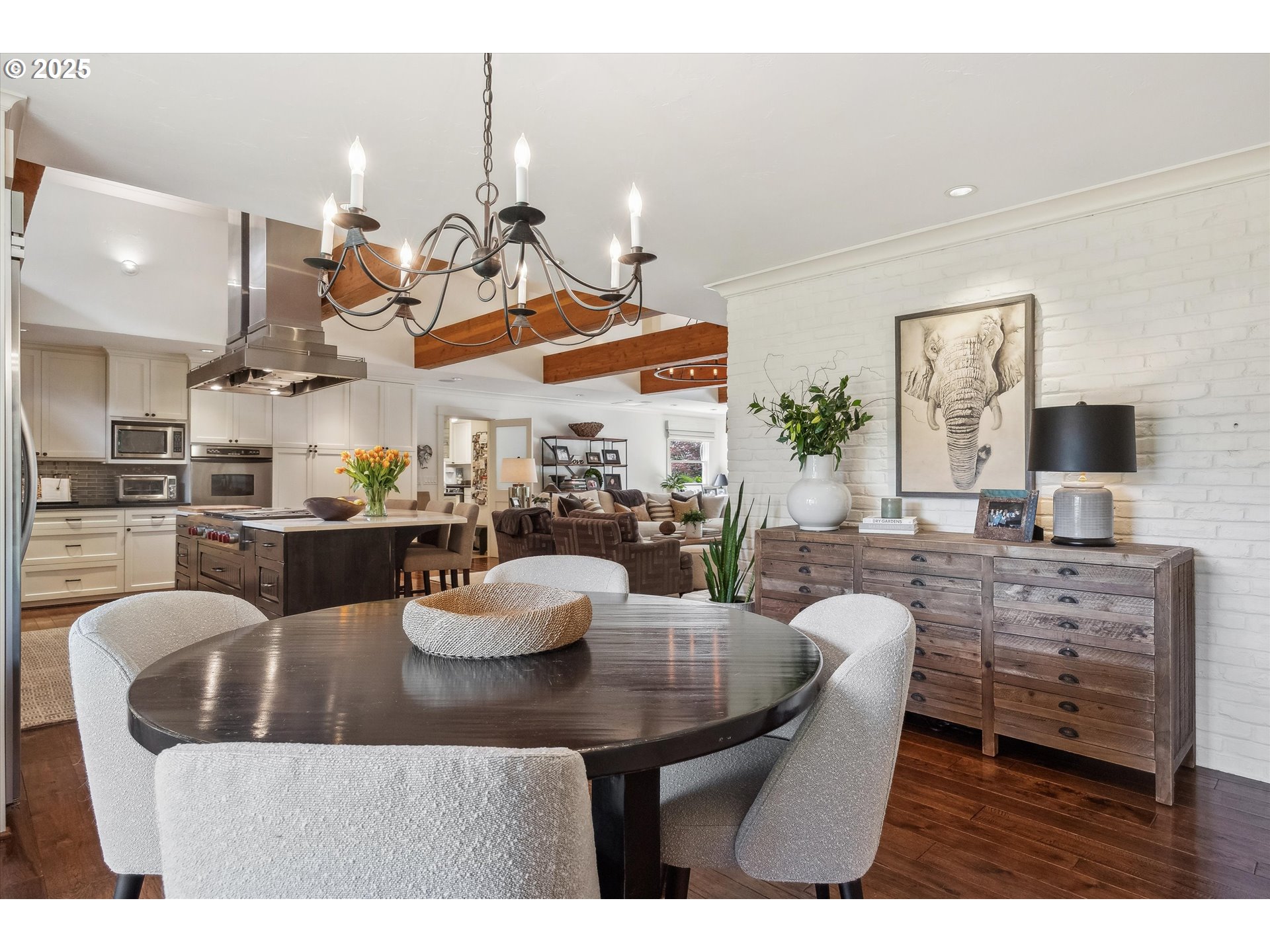 - Exquisite state-of-the-art remodel on desirable Dellwood street with lake easement! This stunning traditional 4-bedroom, 4 bath home blends timeless character with modern updates. Situated on beautifully landscaped grounds complete with a pool and hot tub, outdoor fireplace, and elevated lounge space, this is a true entertainer’s dream! Indoor living mirrors the home’s exceptional outdoor appeal, with vaulted ceilings and exposed wood beams in the family room and kitchen. Quartz countertops, stainless steel appliances, double ovens, a fireplace, and a sunlit breakfast nook framed by bay windows complete the space. The main level also features a living and dining room with fireplace, three bedrooms, including one with a private en-suite and two that share a full bath. Upstairs, the spacious primary suite is a serene retreat with vaulted wood-beamed ceilings, peaceful views of the backyard, and a spa-like bathroom with tub and heated tile floors. A private laundry area and direct access to a separate upstairs office—ideal for remote work or creative pursuits—enhance the suite’s comfort and functionality. Off the garage, a well-designed mudroom, additional full bath, and secondary laundry room add everyday convenience. Don’t miss the wine fridge and extra built-in refrigerators, perfect for effortless entertaining. While the backyard serves as a true outdoor retreat, the home also includes deeded rights to the Palisades easement for lake access. With a covered front porch and lush landscaping, enjoy indoor-outdoor Lake Oswego living at its best!