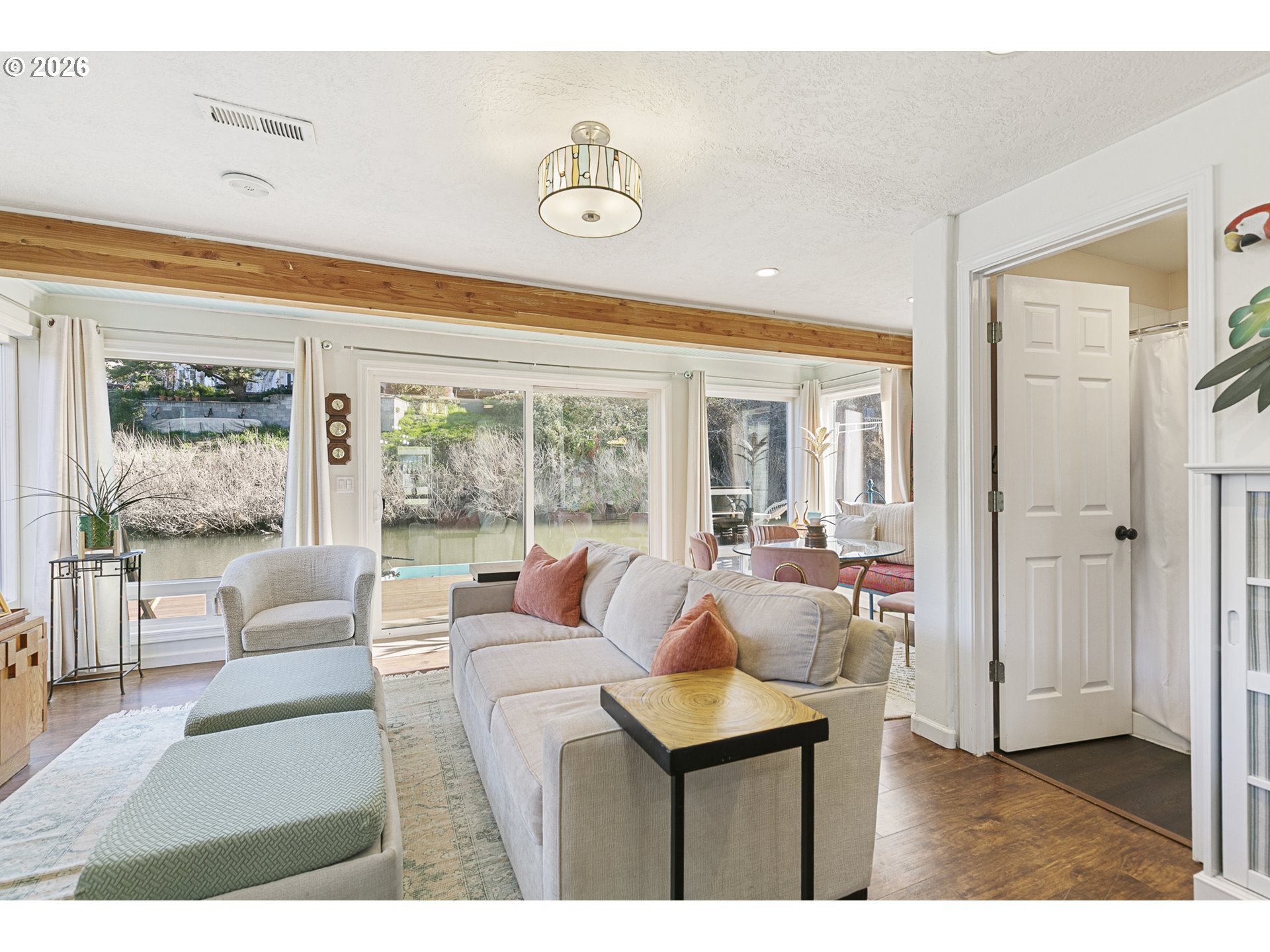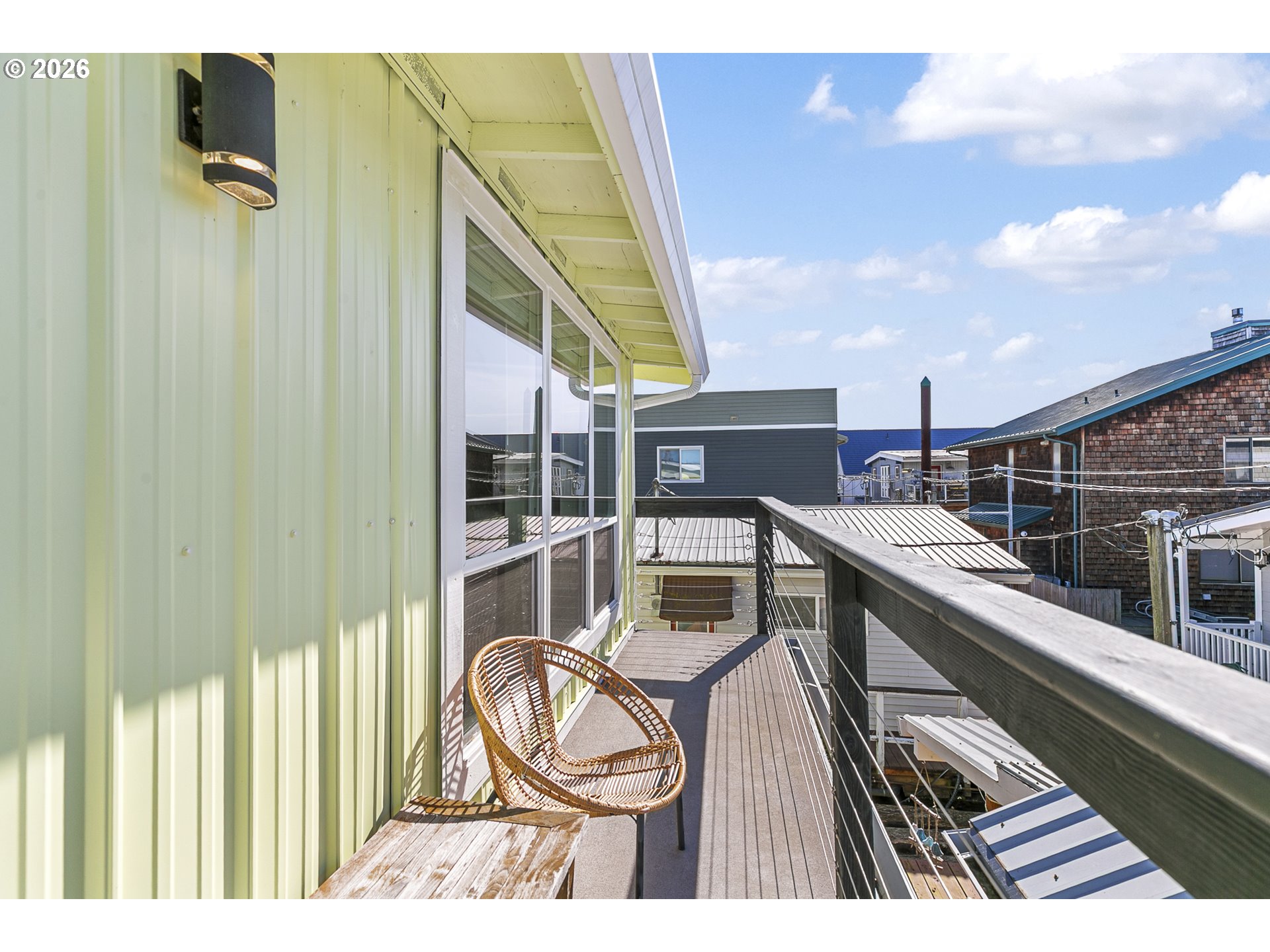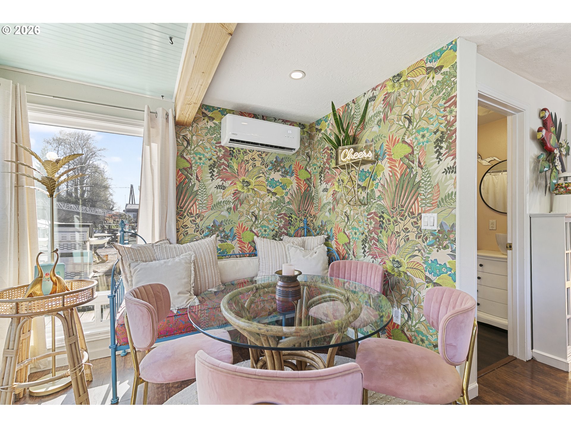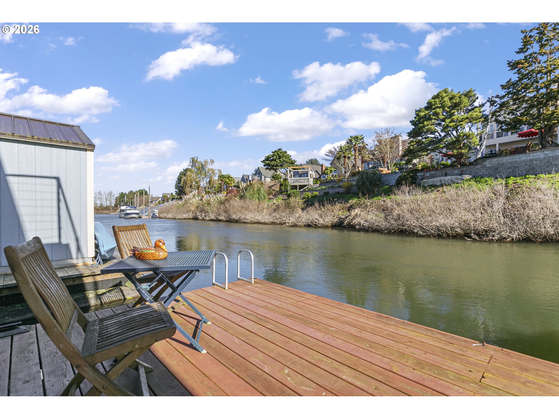 - Rare opportunity to own a home with slip included in the tight-knit Tomahawk Island Floating Home community—one of only ~3,500 floating homes in all of Oregon, making this a truly unique lifestyle. Just 10 minutes from downtown Portland, yet a world away.Wake up to water just outside your door in a home so cheerful it feels like you’re on vacation every day—starting with the charming Dutch front door that instantly sets the tone. Floor-to-ceiling windows along the back create a light-filled, immersive living experience where you feel fully connected to the water—watch kayakers drift by, wildlife pass through, and the light change throughout the day.Extensively updated with major systems completed in the last 4 years: newer roof, siding, gutters, exterior paint, two mini-split HVAC systems, and refreshed balcony railings—offering true turnkey confidence. Strong float rating of 4 in 2021 (20+ years life expectancy) with log float and steel-beam stringers.Inside, the home blends comfort with personality. Interior upgrades include newer refrigerator, all-in-one washer/dryer, new LVT flooring upstairs, and designer wallpaper that adds a whimsical, elevated touch.Approx. 920 SF main home + 110 SF finished tender house, styled as a tiki-inspired retreat—ideal for an office, studio, or guest space, with additional ceiling storage. One of only two homes in the moorage with a detached tender house.1 bedroom, 2 bathrooms, plus an upstairs bonus area with potential to easily create a second bedroom. Two private balconies offer peaceful views of North Portland Harbor and the Columbia River.Slip approx. 33’9”W x 65’L with room to moor your boat right outside your back door..Low HOA dues of $430/month in a pet-friendly, socially active marina. Certified yacht club with reciprocal access to yacht clubs worldwide.A scenic walk down the dock becomes part of the daily rhythm—quiet, peaceful, and uniquely yours.Not just a home—a lifestyle!