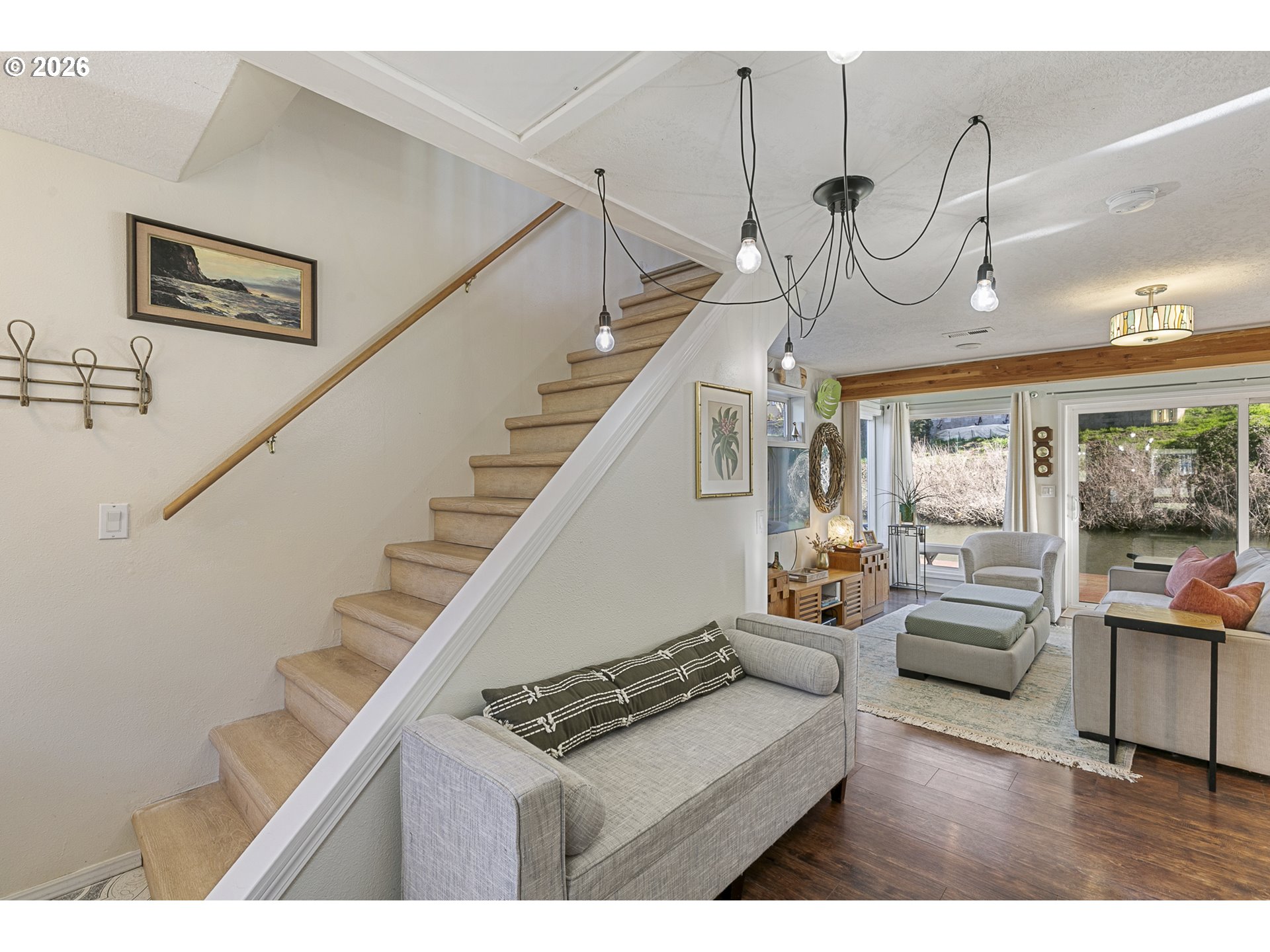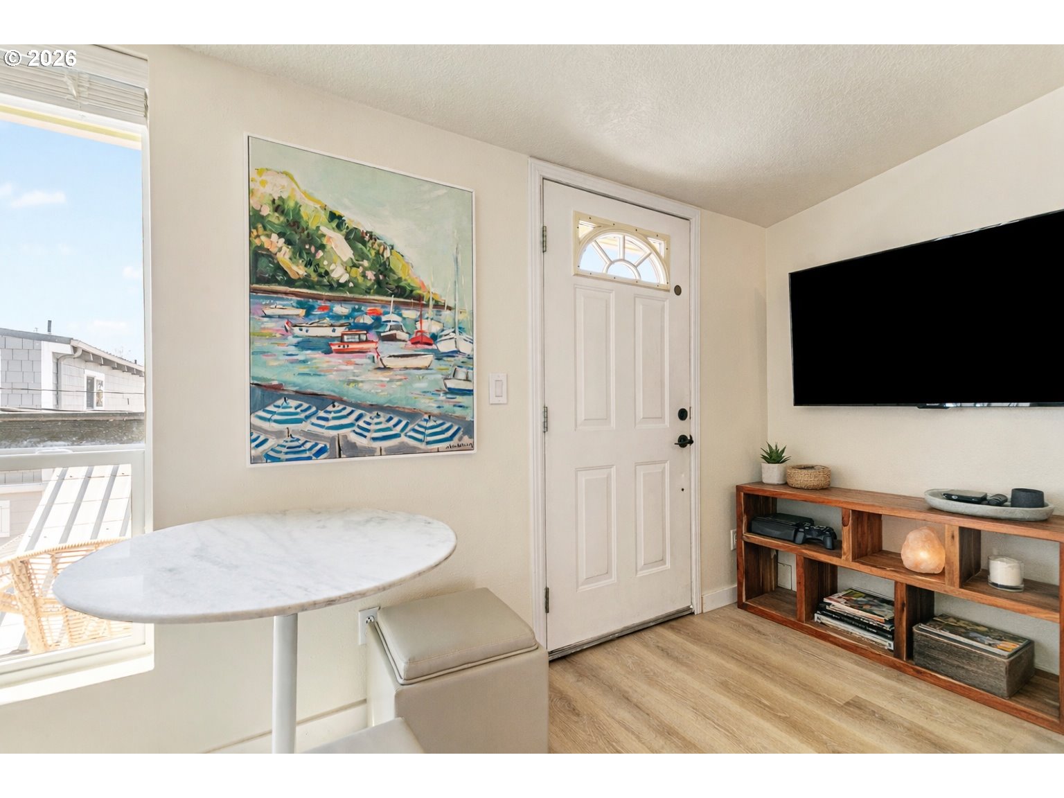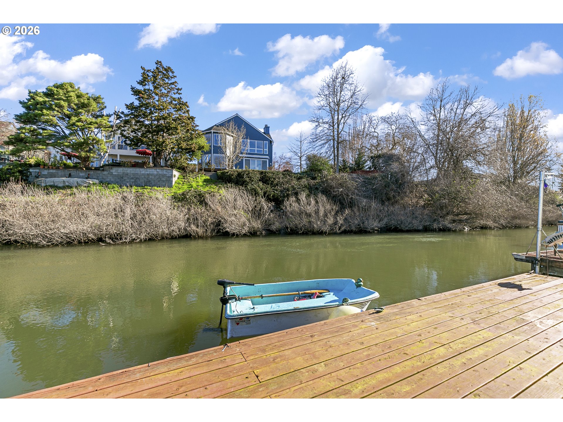 - Rare opportunity to own a home with slip included in the tight-knit Tomahawk Island Floating Home community—one of only ~3,500 floating homes in all of Oregon, making this a truly unique lifestyle. Just 10 minutes from downtown Portland, yet a world away.Wake up to water just outside your door in a home so cheerful it feels like you’re on vacation every day—starting with the charming Dutch front door that instantly sets the tone. Floor-to-ceiling windows along the back create a light-filled, immersive living experience where you feel fully connected to the water—watch kayakers drift by, wildlife pass through, and the light change throughout the day.Extensively updated with major systems completed in the last 4 years: newer roof, siding, gutters, exterior paint, two mini-split HVAC systems, and refreshed balcony railings—offering true turnkey confidence. Strong float rating of 4 in 2021 (20+ years life expectancy) with log float and steel-beam stringers.Inside, the home blends comfort with personality. Interior upgrades include newer refrigerator, all-in-one washer/dryer, new LVT flooring upstairs, and designer wallpaper that adds a whimsical, elevated touch.Approx. 920 SF main home + 110 SF finished tender house, styled as a tiki-inspired retreat—ideal for an office, studio, or guest space, with additional ceiling storage. One of only two homes in the moorage with a detached tender house.1 bedroom, 2 bathrooms, plus an upstairs bonus area with potential to easily create a second bedroom. Two private balconies offer peaceful views of North Portland Harbor and the Columbia River.Slip approx. 33’9”W x 65’L with room to moor your boat right outside your back door..Low HOA dues of $430/month in a pet-friendly, socially active marina. Certified yacht club with reciprocal access to yacht clubs worldwide.A scenic walk down the dock becomes part of the daily rhythm—quiet, peaceful, and uniquely yours.Not just a home—a lifestyle!