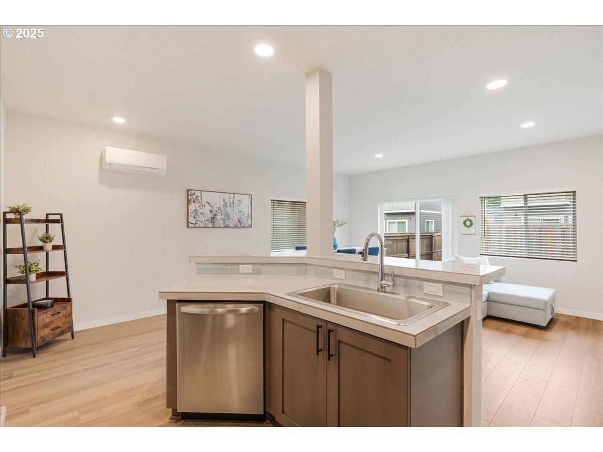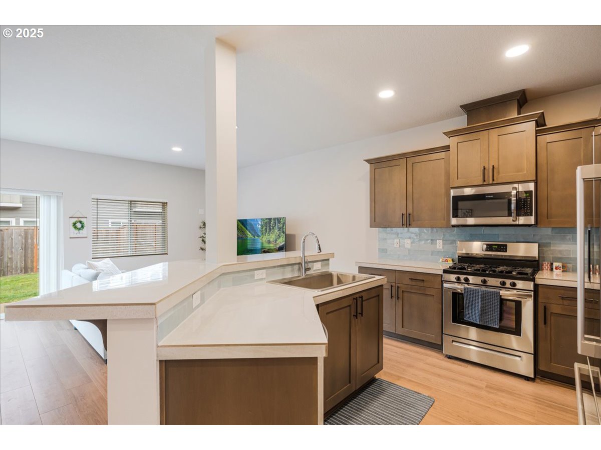 - This stunning 3 bedroom, 2.5 bath end unit townhome is packed with high-end designer upgrades and is truly move-in ready! This home features 8 foot doors, high ceilings and a bright and open great room design on the main level. The thoughtfully designed kitchen features upgraded stainless steel appliances, a gas stove, pantry, a tile backsplash and a large island with an eat-bar that is perfect for entertaining. The vaulted and spacious primary suite offers a large walk-in closet, a walk-in shower and double sinks. Additional highlights include energy-efficient mini split heating and cooling, plus a fully fenced backyard with sod already installed! Located in a vibrant community with parks, playgrounds, basketball courts, a soccer field and paved walking trails.