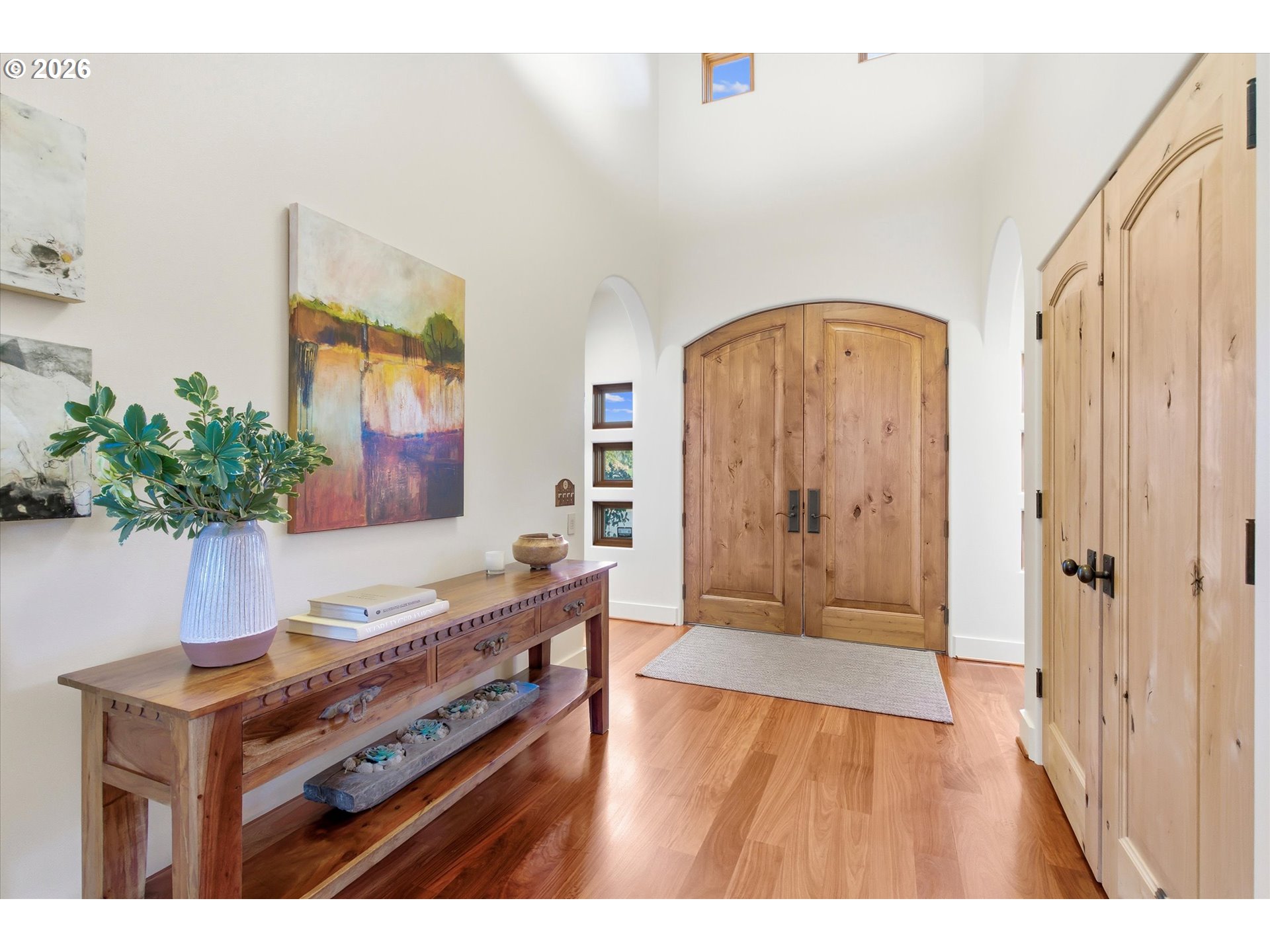 - Properties of this architectural scale and land profile are rarely brought to market. Framed by a circular drive, this single level estate spans 3.33 private acres within the Groner enclave, shaped by land, privacy, and architectural intention. A grand entry reveals soaring wood clad ceilings and substantial exposed timber beams that establish immediate scale and structural presence. Expansive sightlines create volume without excess, while separated living spaces balance openness with intention. Meticulously hand selected wood detailing reflects a level of craftsmanship and timber scale rarely found today. Hardwood floors, curved archways, thick plaster walls, and wood framed windows reinforce the home’s architectural integrity. Westerly sunset views stretch across protected reserve land as indoor and outdoor living connect seamlessly through a large covered courtyard with fireplace. Adobe and stone fireplaces introduce warmth and character across the main living areas. Sub Zero, Dacor, and Miele appliances anchor a kitchen with custom cabinetry, positioned as the true heart of the home. A spacious family or bonus room includes custom built ins, a fireplace, and a generous sitting area. The primary suite is privately positioned and designed as its own retreat, featuring a fireplace, sitting area, private patio, spa like bath, walk in closet, and direct access to the covered outdoor living space. Grounds designed by renowned landscape architect Michael Schultz feature established landscaping, orchard trees, greenhouse, and usable acreage. A finished 1,700 sq ft creative structure with full bath includes a dedicated woodshop and art studio, offering substantial space for makers, collectors, or extended living. A separate 448 sq ft studio provides versatile space ideal for wellness, creative work, or private retreat. Private in setting, yet well connected to dining, shopping, and daily conveniences. An estate of this scale and distinction is rarely available.