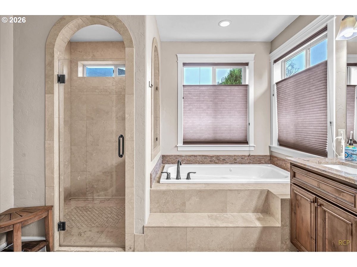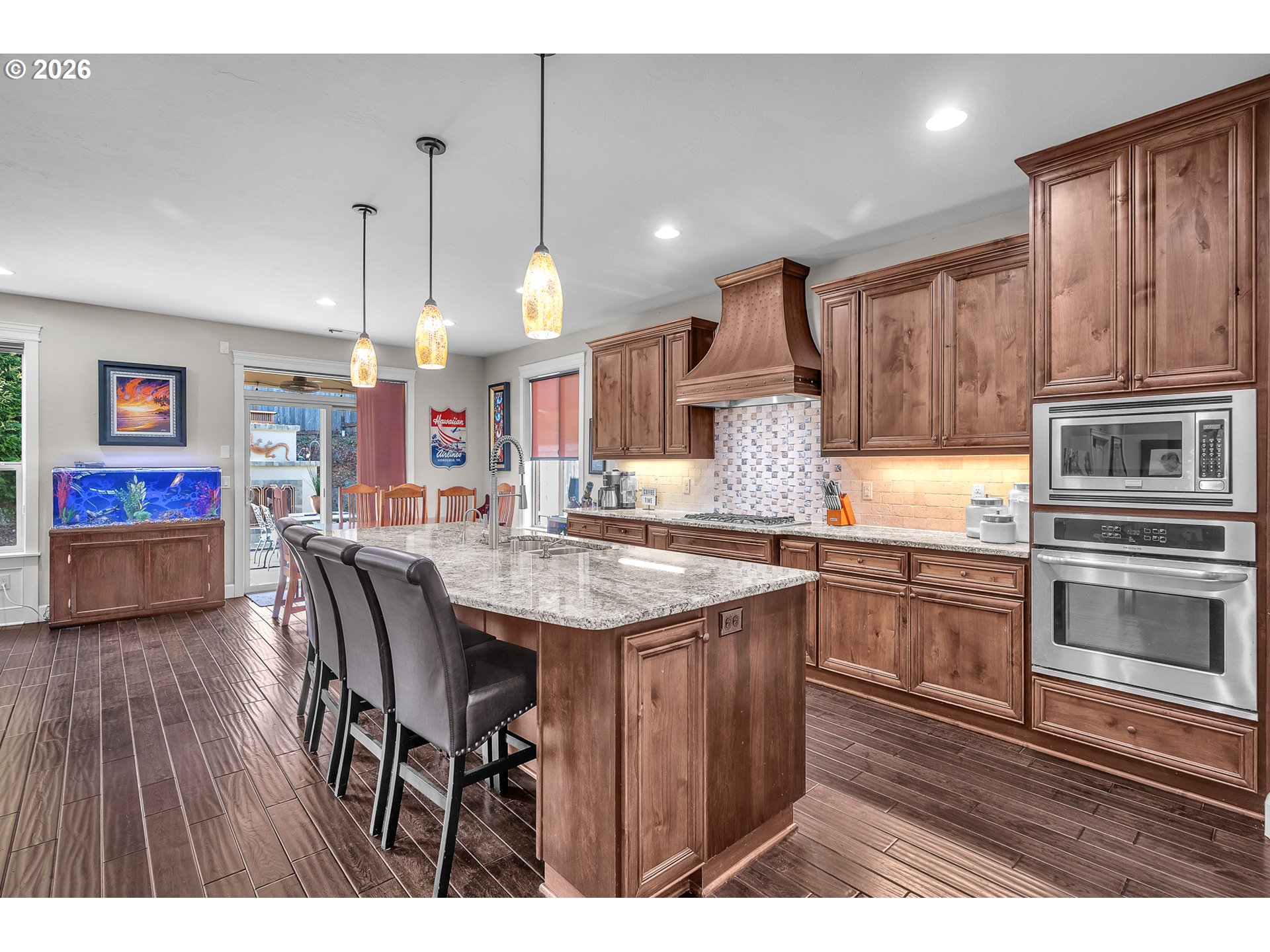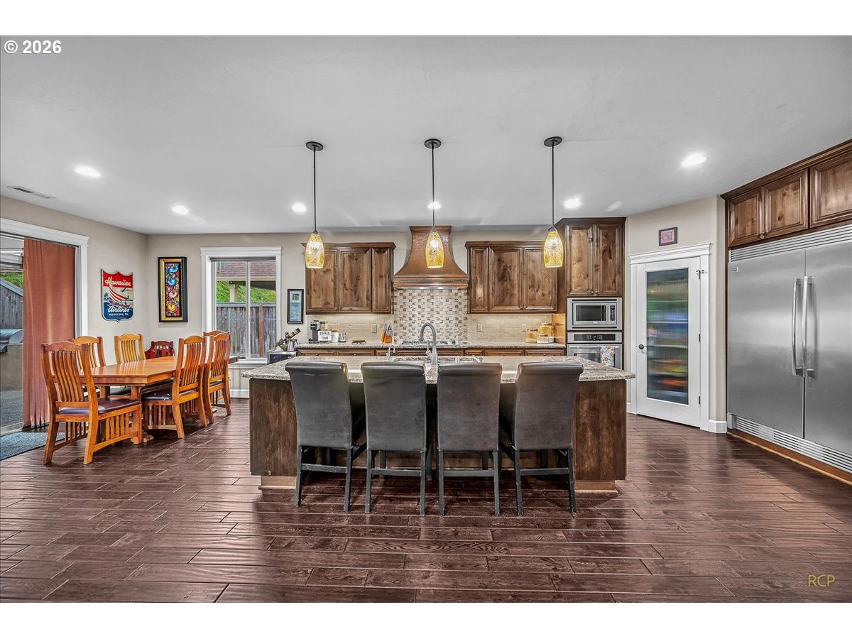 - Beautifully-crafted single-level Bella Villa Homes 3 bed, 2 bath open-concept home on large lot offering timeless design and high-quality finishes throughout. You will love the wide hallways, 9’ ceilings, gorgeous hardwood floors, ceiling fans, and excellent natural light. The great room includes custom wood built-ins, a floor-to-ceiling stone fireplace, and a wall of windows overlooking the private backyard. The kitchen is both elegant and functional with granite countertops, stainless appliances, gas range w/ copper hood, built-in oven & microwave, Frigidaire Pro refrigerator, travertine backsplash, oversized island, and walk-in pantry. A formal dining room with wainscoting and fresh paint offers flexibility for a home office or den. The primary suite is a true retreat with heated travertine floors, updated shower with heated floors, and custom closet with massive custom shoe caddy. Outdoor living shines with the Custom outdoor masonry fireplace with stone detailing & metal fire screen, creating a striking focal point for the covered patio and the new built-in BBQ with stone surround, extending outdoor use well into cooler seasons for outdoor entertaining. Large private yard has raised beds, raspberries, grapevines and mature landscaping. Convenient location near shopping, restaurants and transportation. Rare single-level living on quiet cul-de-sac with enduring quality and comfort is a must see!