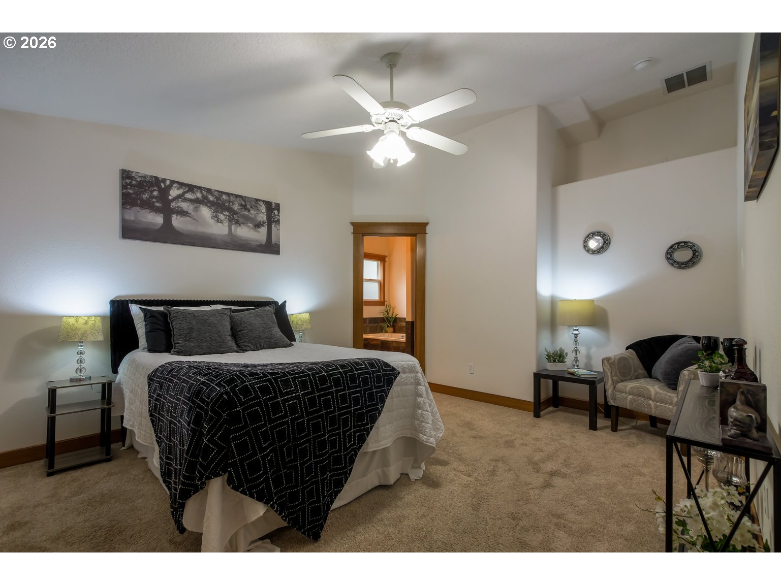 - Come & relax in your own private paradise. Long private driveway with RV parking provides plenty of parking or an area for play. This home will welcome you with a warm entryway with stunning hardwood floors in the vaulted kitchen, dining room, & vaulted bonus area (currently staged for dining room). Gourmet kitchen with high-end ceiling height kitchen cabinets, cabinet height backsplash, granite slab counters with breakfast bar, top-of-the-line Thermador gas range & Thermador dishwasher. Step down spacious vaulted living room with stone floor, with a built-in entertainment center, built-in storage cabinetry & desk on the north wall. 3-sided gas fireplace with remote makes a cozy evening convenient & easy. Your living room provides access to your covered back patio that overlooks a gorgeous green space for ultimate privacy for your morning coffee, or just relaxing while you listen to the birds & frogs in the evenings. Your primary bedroom features an attached bath with a double sink vanity, walk in closet, a soaking tub, and a remodeled tile shower. For those nights that you just need to have some "you time", the slider from the primary to the extended cover deck will take you to a hot tub where you can soak your stress away. For those summer evenings, the stone terrace will shine as a gathering place. Back inside, the hallway to the right at the front entry will lead you to an updated 2nd bathroom, & 2 more bedrooms. From the moment you pull into your private driveway, you can feel the home welcoming you to come in, relax, & unwind in your new home that oozes with high-end details & appeal. This home is your needle in the haystack with privacy, a convenient location to shopping, restaurants & only minutes from the freeway that you have been searching for.