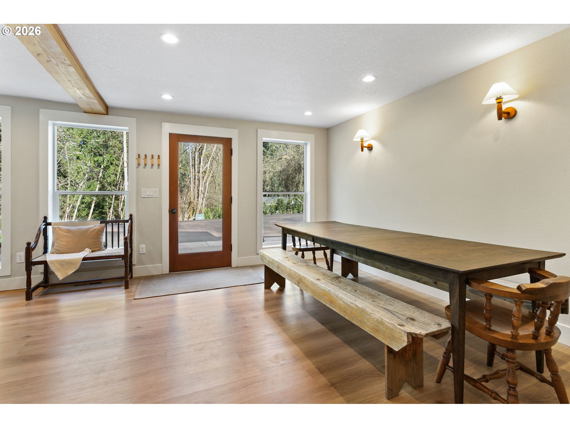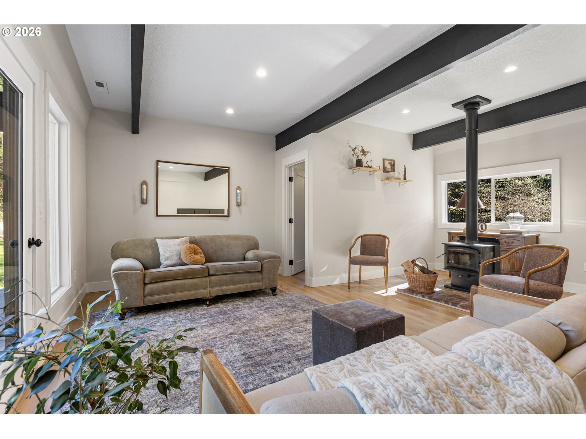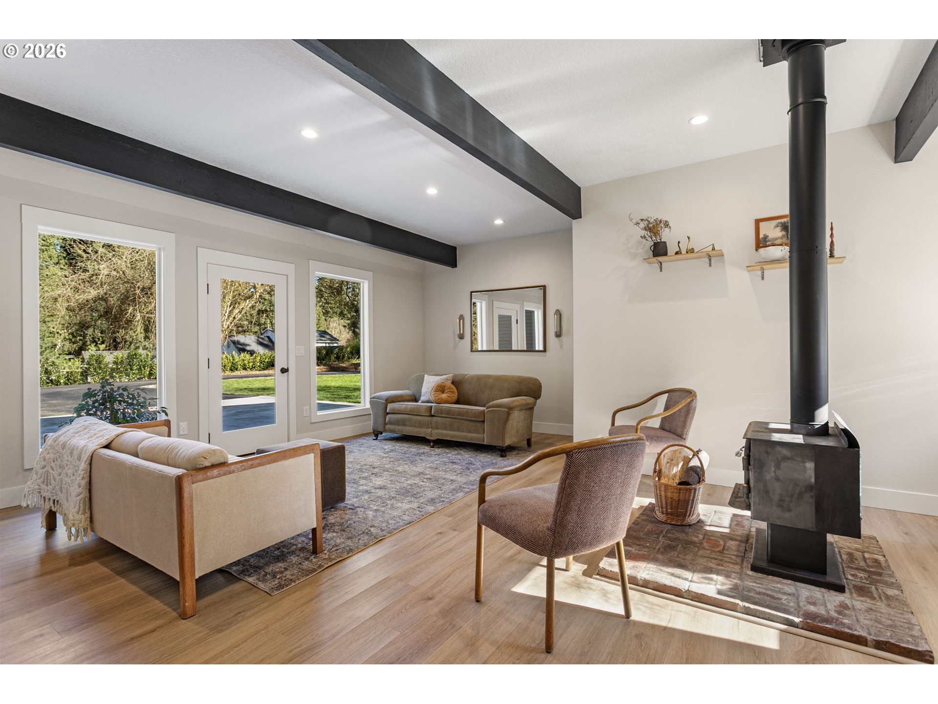 - BEAUTIFUL HOME ON AN AGERAGE!! Tucked away on a private, level 1 acre lot, this 3 bed, 2 bath home offers 2,358 sqft of comfortable living with a great mix of space and privacy. This home has been fully renovated with a clean, modern design. It features a kitchen with all new cabinets, countertops, and appliances, opening nicely into the main living areas.You’ll find two separate living spaces; one with a cozy wood burning stove and the other with a built in electric fireplace. Giving flexibility for everyday living or entertaining. The primary suite is spacious with high ceilings, its own electric fireplace, a nursery, and a storage room tucked away to the side. The primary bath includes dual vanities and a walk-in shower.Outside is where this property really stands out. A large covered concrete patio with a timber frame cover creates an ideal outdoor living space, complemented by concrete walkways and bordered flower beds. The freshly paved private driveway leads you into a peaceful setting with a flat, usable yard and a stream behind the home. Quiet and private, yet conveniently located just minutes from shopping and amenities, this is one you don’t want to miss. Schedule your showing today! The adjacent 4 acre lot is for sale also.