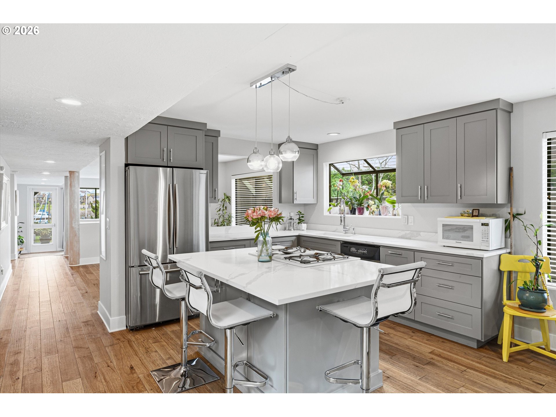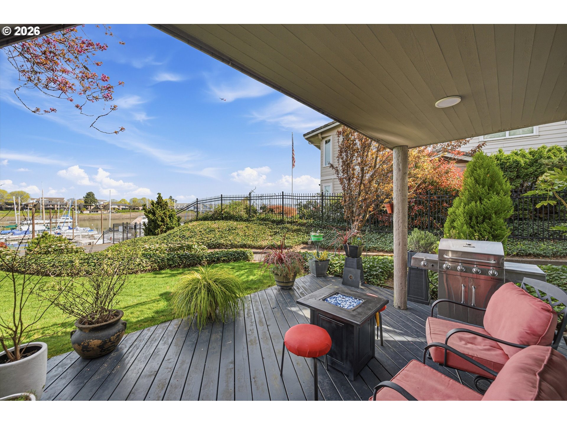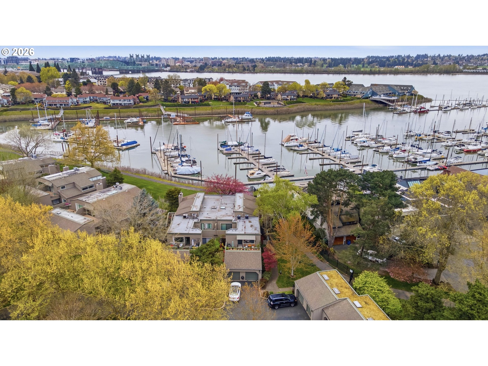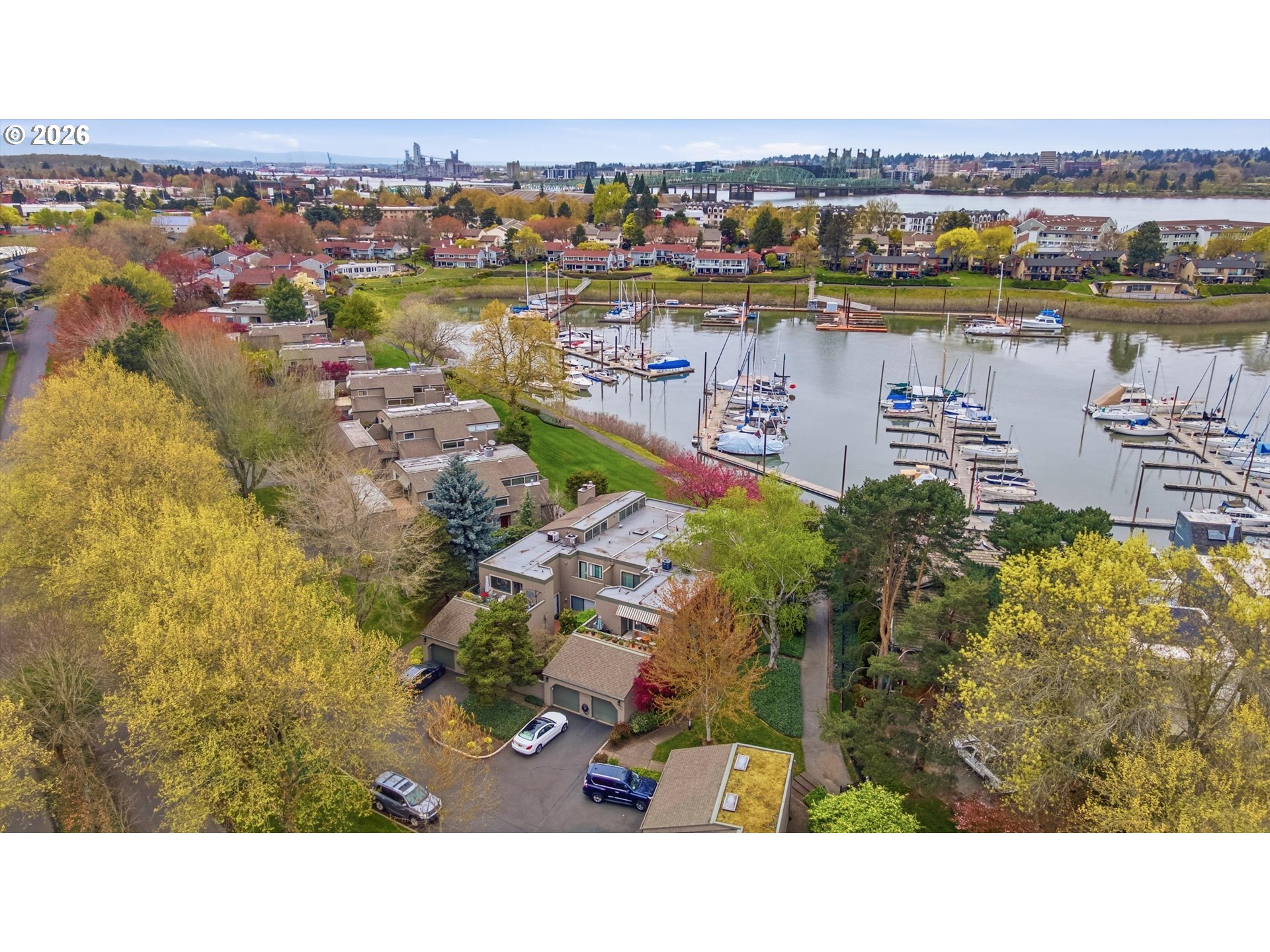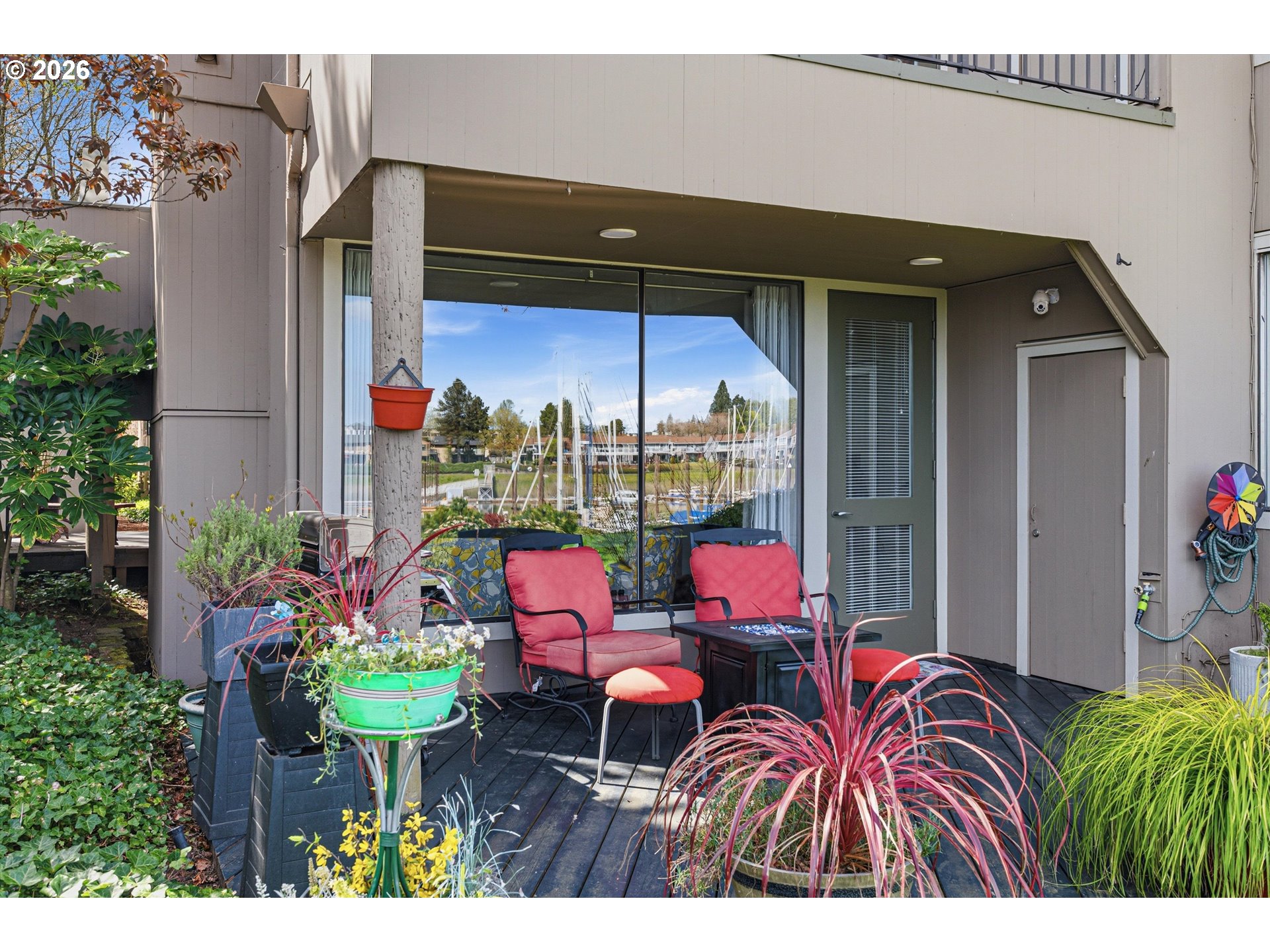 - Wake up to the gentle shimmer of the river and end your evenings with golden reflections dancing across the marina, this stunning ground-level condominium offers a front-row seat to it all. Perfectly positioned along a scenic waterfront path, this home blends effortless luxury with the calming rhythm of nature, all framed by beautifully curated, park-like landscaping. Inside, a light-filled, open design welcomes you with rich wood flooring and an inviting sense of space. The sunken living room creates a warm, intimate gathering area, complete with a cozy gas fireplace and direct access to a private covered patio, ideal for morning coffee or sunset unwinding. Entertain with ease in the open concept formal dining room. The kitchen is both stylish and functional, bathed in natural light and thoughtfully appointed with quartz countertops, an island, and a charming breakfast nook, perfect for everything from casual mornings to lively gatherings. Don't miss the massive pantry! The primary suite offers a tranquil escape, featuring a spacious ensuite bath and views of the boats, it's truly your own quiet sanctuary. A second bedroom has gorgeous floor to ceiling sliding doors, leading out to a completely private patio bursting with beautiful plantings and spring blooms. Adjacent to a second full bath, it provides versatility for guests, a second living room, or whatever your lifestyle demands. The finished attached garage is heated with tile floors and offers a third option perfect for artistic endeavors or a very private work from home space. With a 2nd detached garage, storage and convenience are never in short supply. All of this, just moments from shopping, dining, and everyday essentials, yet tucked into a serene waterfront setting that feels worlds away. This is more than a home—it’s a lifestyle defined by beauty, comfort, and the timeless allure of life on the water.