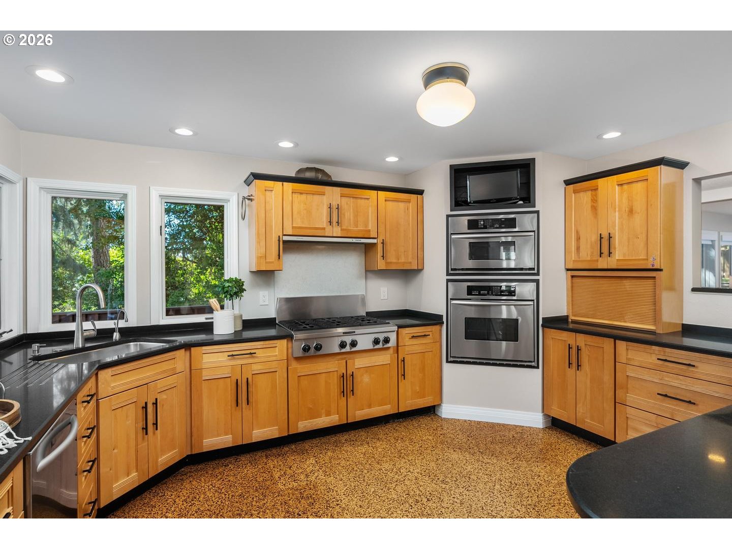 - Soaring ceilings and great light on huge .45 acre lot at end of cul-de-sac in desirable Bridlemile. Remodeled kitchen with slab granite counters, two sinks and stainless gas appliances, including six burner professional grade range, two convection ovens and built-in refrigerator. Adjacent breakfast nook has glass doors leading to expansive deck. Two-story living room with wall of south-facing windows and newer gas stove. Good size family room also has wall of windows. Impressive, three-story entry hall. Main floor bedroom and full bathroom with new vanity and tile shower with glass enclosure perfect for visiting family. Spacious primary suite with huge walk-in-closet, tile shower and soaking tub. Hall bath features dual vanities and subway tile tub/shower. Office with two built-in workstations, cabinets and high ceiling. Convenient upstairs laundry. Expansive, private yard with entertaining size deck and paver stone patio, two large, level sections of lawn, spacious tool shed and space to park an RV or boat. Two short blocks on quiet cul-de-sacs to private entrance to Kelley Park. Desirable Bridlemile elementary, Robert Gray middle school and Ida B Wells high school. [Home Energy Score = 1. HES Report at https://rpt.greenbuildingregistry.com/hes/OR10231513]