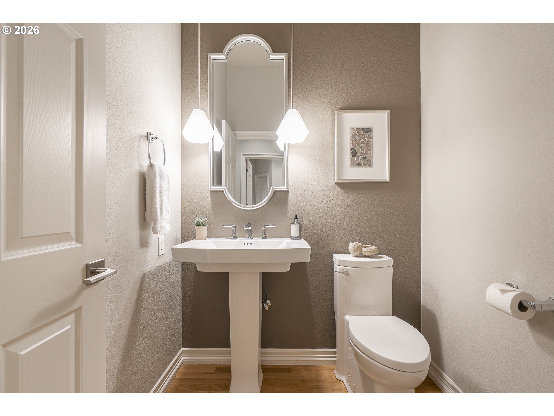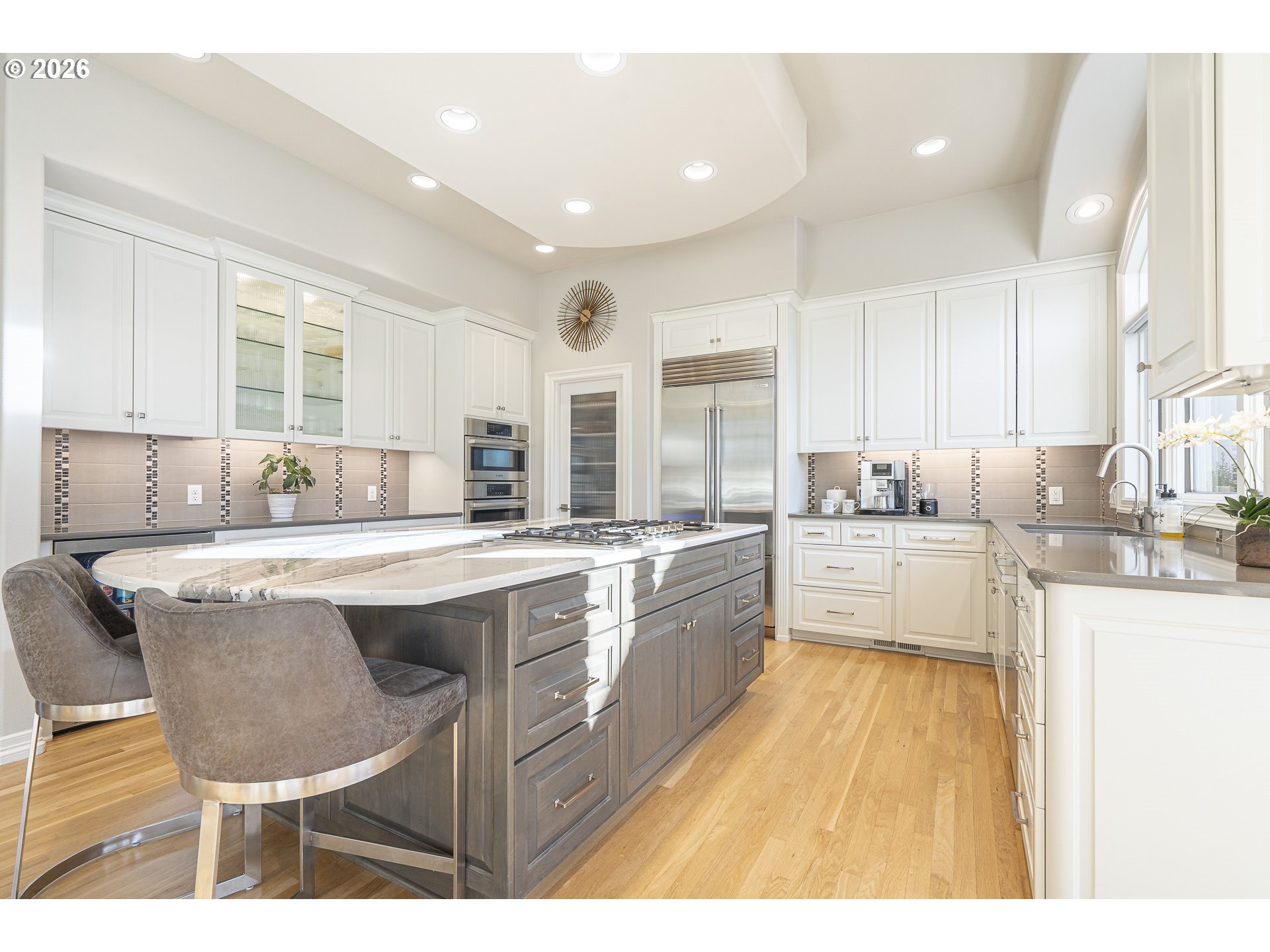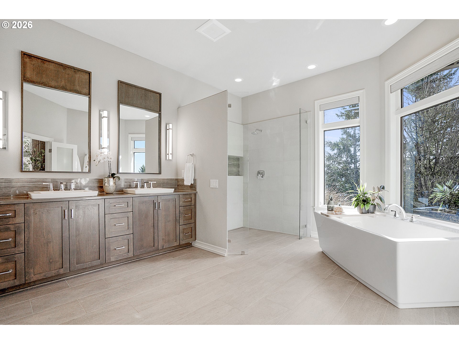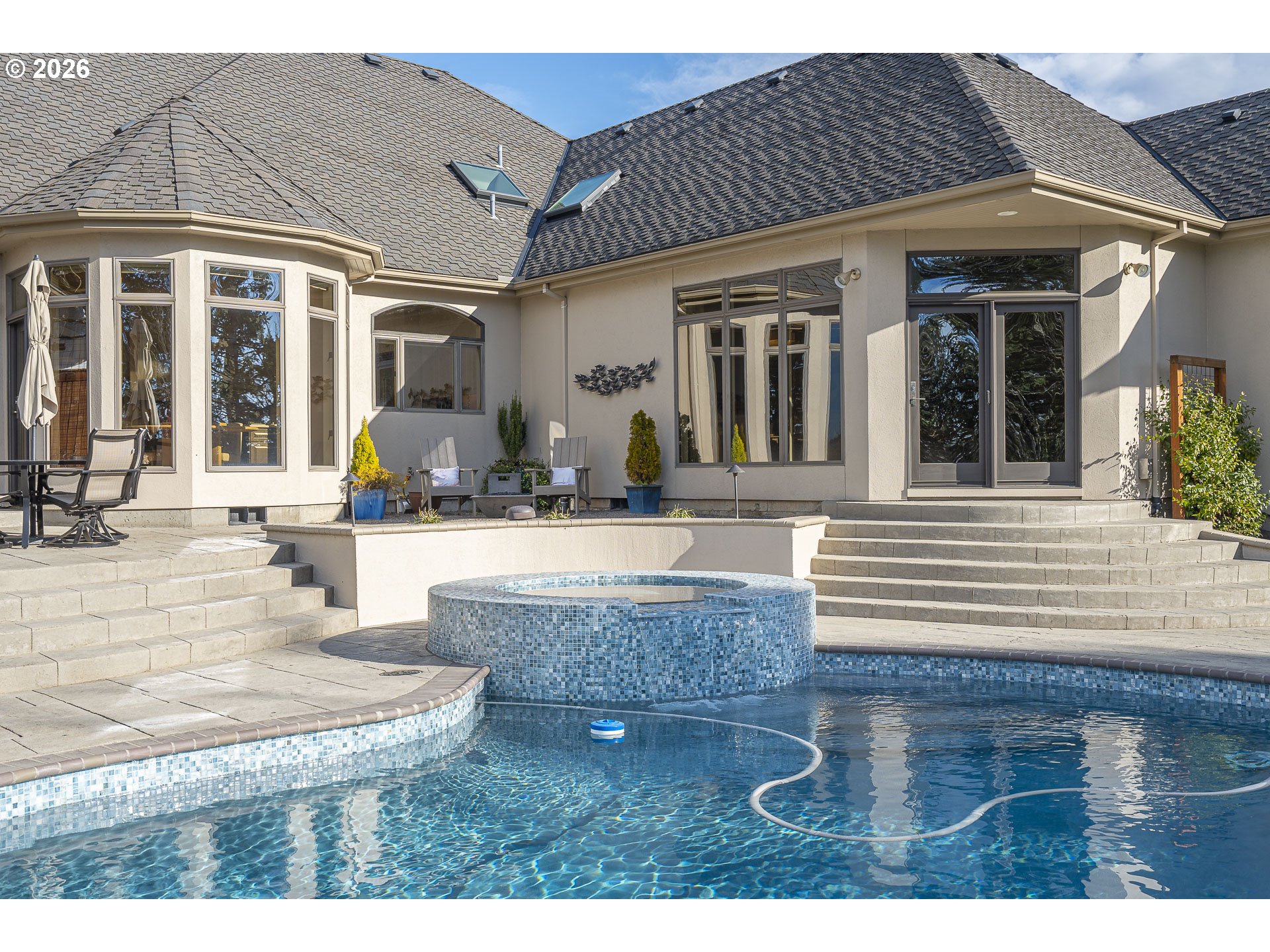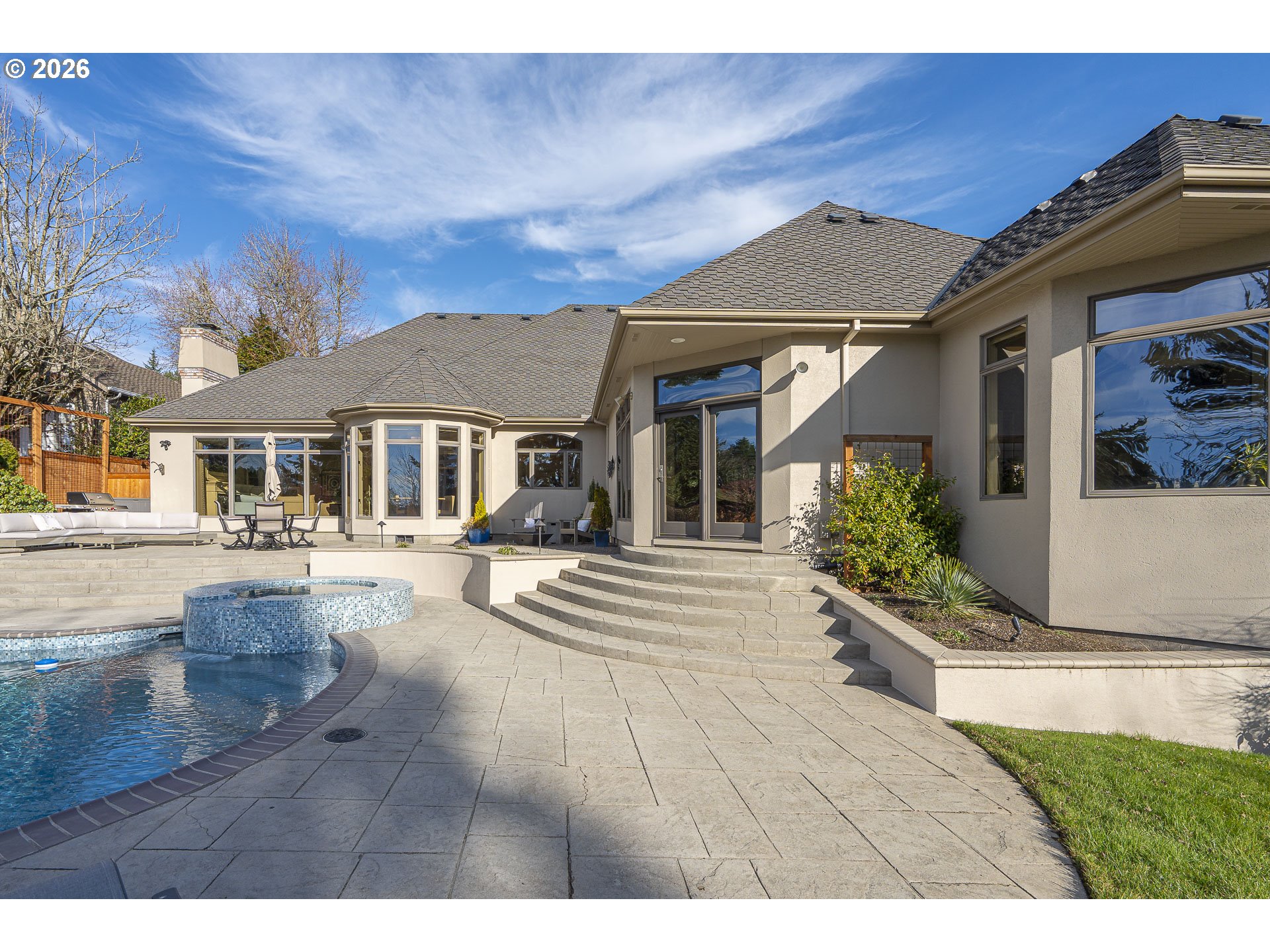 - Rare one-level luxury home in Barrington Heights. Located on a private .37-acre lot in West Linn's premier neighborhood, this residence combines intentional design with high-end quality. The grounds feature a newly resurfaced in-ground saltwater pool and waterfall spa, supported by new high-efficiency equipment. A stamped concrete patio and established, professionally maintained gardens backing to a private, wooded green space. The interior is defined by an open, accessible floor plan with high ceilings, detailed millwork, and extra-wide hallways, that accommodate effortless mobility. The entry connects a formal sitting room with a gas fireplace to a dining area featuring a built-in buffet. In addition to three spacious bedrooms, the home includes a dedicated office with built-ins. Both full bathrooms have been renovated with heated tile floors, complemented by an updated guest powder room. The primary suite overlooks the pool through a wide glass-paneled door and windows, creating a seamless visual connection to the patio. The ensuite is designed with a barrier-free curb-less shower, double vanity, heated floors, and a free standing soaking tub. All bedrooms are outfitted with "Closets by Design" organization systems. The kitchen is equipped with top-tier appliances, a beverage fridge, and a walk-in pantry. It opens to a family room where a wall of windows frames views of the pool, mountains and natural wooded space. This accessible design combines seamless one-level living with wide transitions and barrier free entry points. The garage has oversized 3-car capacity with concrete coated floors by Webfoot, storage and utility sink. Unfinished lower level is full-height with exterior access, gives potential for additonal finished sq. ft. Systems include ring security cameras, SimpliSafe security, ext. lighting, irrigation, patio speakers, and central vacuum system. Experience this exceptional high-end home with impeccable design!