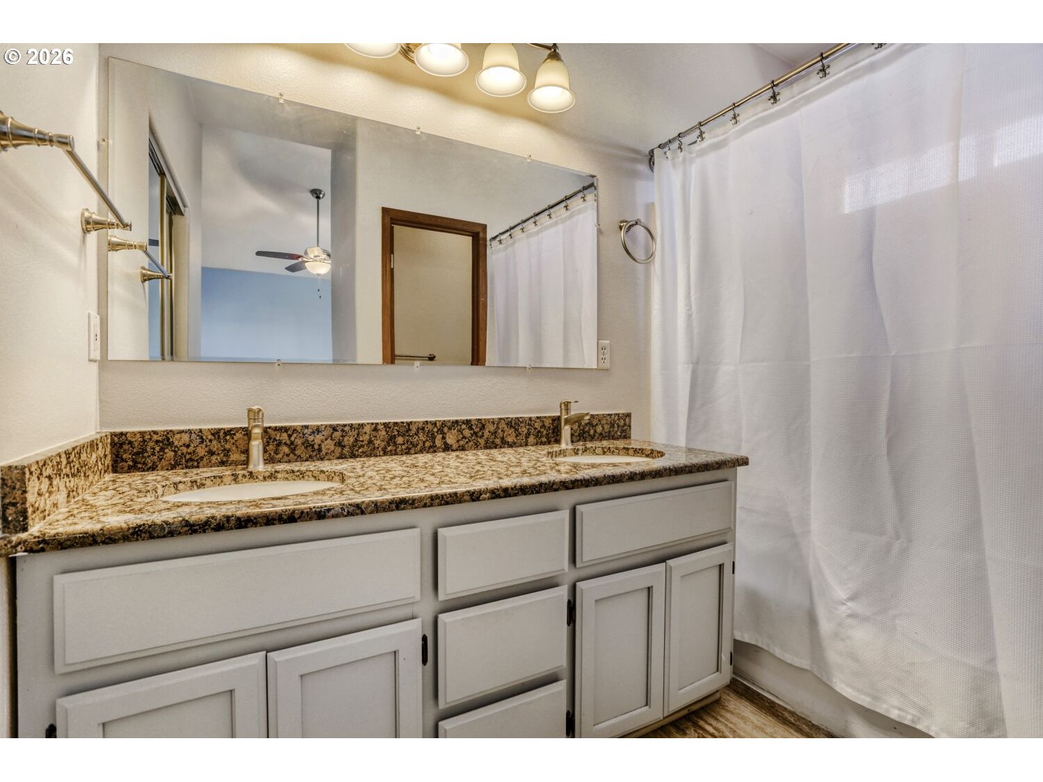 - Discover the perfect blend of modern comfort and effortless style in this move in ready single level home. Featuring three bedrooms and two full bathrooms, the residence has been thoughtfully updated throughout to provide a fresh, contemporary feel. The heart of the home is an expansive open concept great room where the kitchen, dining, and family areas flow seamlessly together under soaring vaulted ceilings. Flooded with natural light, this inviting space is anchored by a cozy fireplace, perfect for relaxing evenings. The primary suite serves as a true private retreat, boasting an elegant ensuite bathroom with a dual vanity and direct slider access to the back patio.Recent upgrades add both style and peace of mind, including luxury vinyl flooring, a new dishwasher, updated blinds, and refreshed bathrooms with new toilets, sinks, and granite countertops. Ceiling fans have been added in the living room, family room, and primary bedroom for enhanced comfort. Major system improvements include a newer A/C and furnace, as well as an Aquasana whole-house water filtration system. The exterior was freshly painted last fall, completing the home’s polished look. Whether you’re hosting a dinner party in the bright living area or enjoying a quiet morning coffee outdoors, this home is designed for easy living, thoughtful updates, and modern convenience. [Home Energy Score = 6. HES Report at https://rpt.greenbuildingregistry.com/hes/OR10243965]