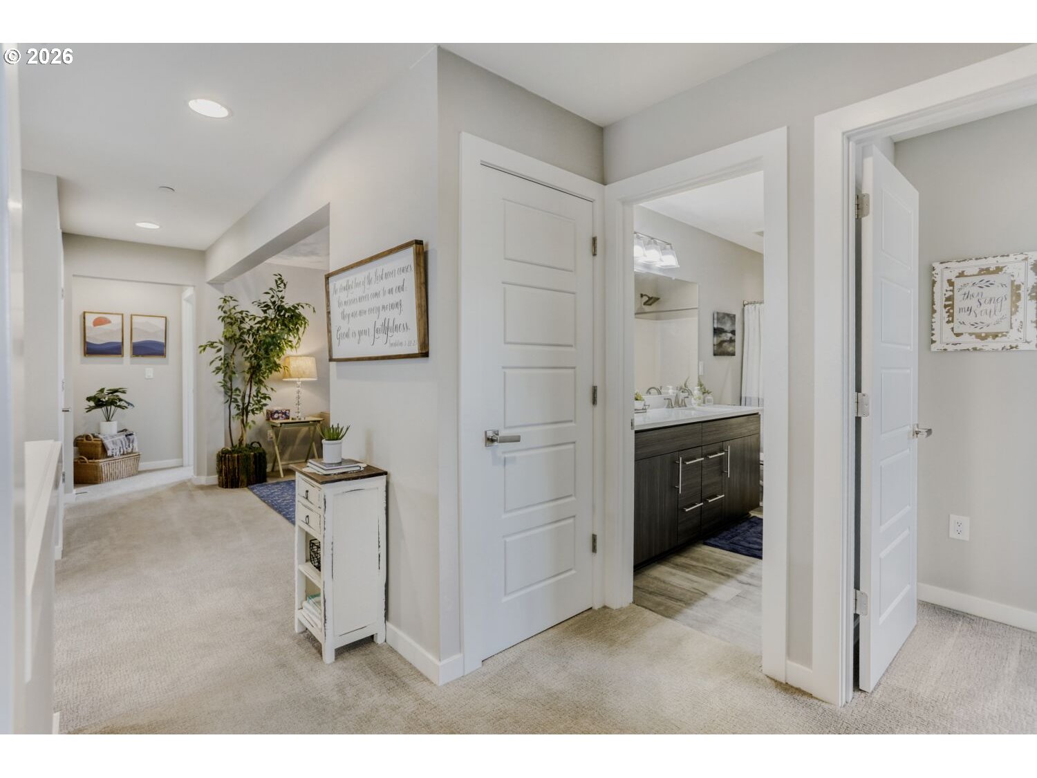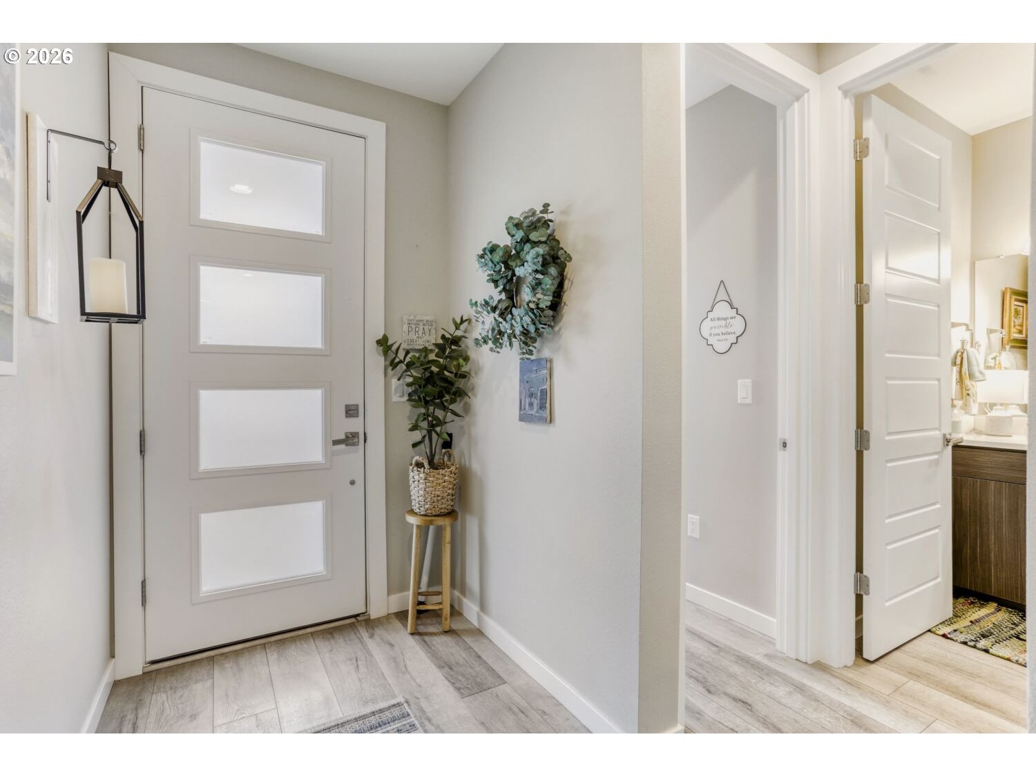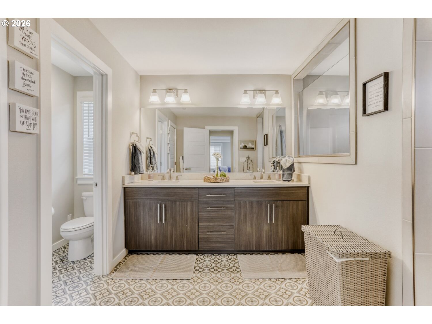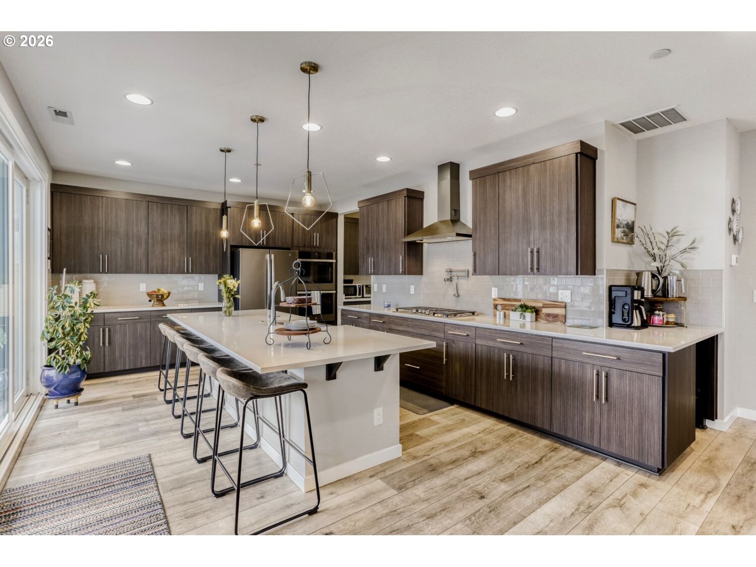 - This 3,086 sq ft home offers 5 bedrooms and 3 full baths, including a main-level bedroom and bath ideal for guests or multigenerational living. The open kitchen features quartz countertops, a stainless farm apron sink, pot filler, double wall ovens, slide-out cabinetry, a coffee bar with space below for an undercounter beverage or wine fridge, a large pantry, and a butler’s pantry for added storage and prep space. An expansive sliding door off the kitchen opens to the outdoor patio, creating an easy indoor-outdoor flow. Luxury vinyl plank flooring runs throughout the main level. Upstairs, you’ll find four carpeted bedrooms, two full baths, and a convenient laundry room complete with washer, dryer, sink, and cabinetry. The primary suite enjoys views of Mt. Hood and includes a tiled ensuite with dual sinks, a walk-in shower, linen closet, and separate his-and-hers closets. Quartz countertops are featured in all bathrooms. Home also has a residential interior fire sprinkler system designed to enhance safety and potentially reduce insurance costs. HOA maintains all of front landscaping.