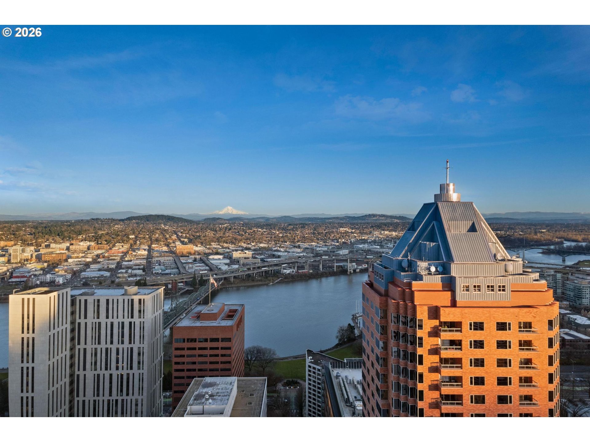 - Step into classic New York sophistication where you'll experience unparalleled luxury on the 23rd floor of KOIN Tower at Fountain Plaza. This extensively remodeled condominium boasts stunning views of the city, Mt. Hood, Mt. St. Helens, Mt. Adams, and the Willamette River. The residence features two spacious bedrooms, two full baths, and floor-to-ceiling windows that fill the space with abundant natural light. The updated chef’s kitchen is a standout, equipped with premium stainless-steel appliances, custom cabinetry, bench seating, and stylish hardwood and tile floors. The primary suite includes an expansive walk-in closet and a spa-like bathroom with a luxurious shower, while the versatile second bedroom is ideal for guests or a home office. Relax on the covered patio and immerse yourself in the vibrant yet serene environment of the arts district and revel in the luxury of a grand lobby with 24-hour concierge service. Located steps from premier shopping, dining, and entertainment, this sophisticated high-rise home offers urban living at its finest. EV charger!!! Don’t miss this rare opportunity to own a gem in Fountain Plaza. NEW EV charger!