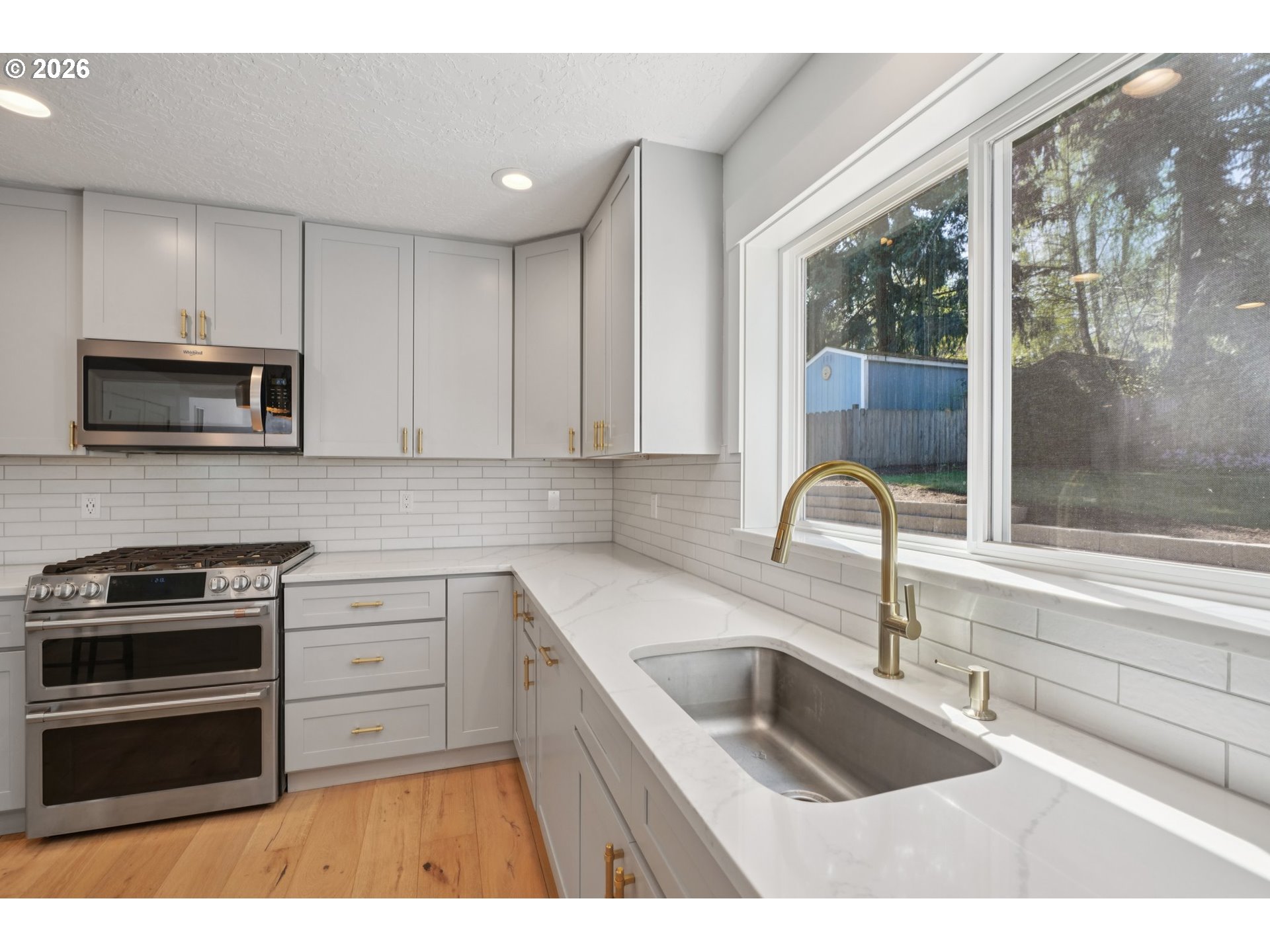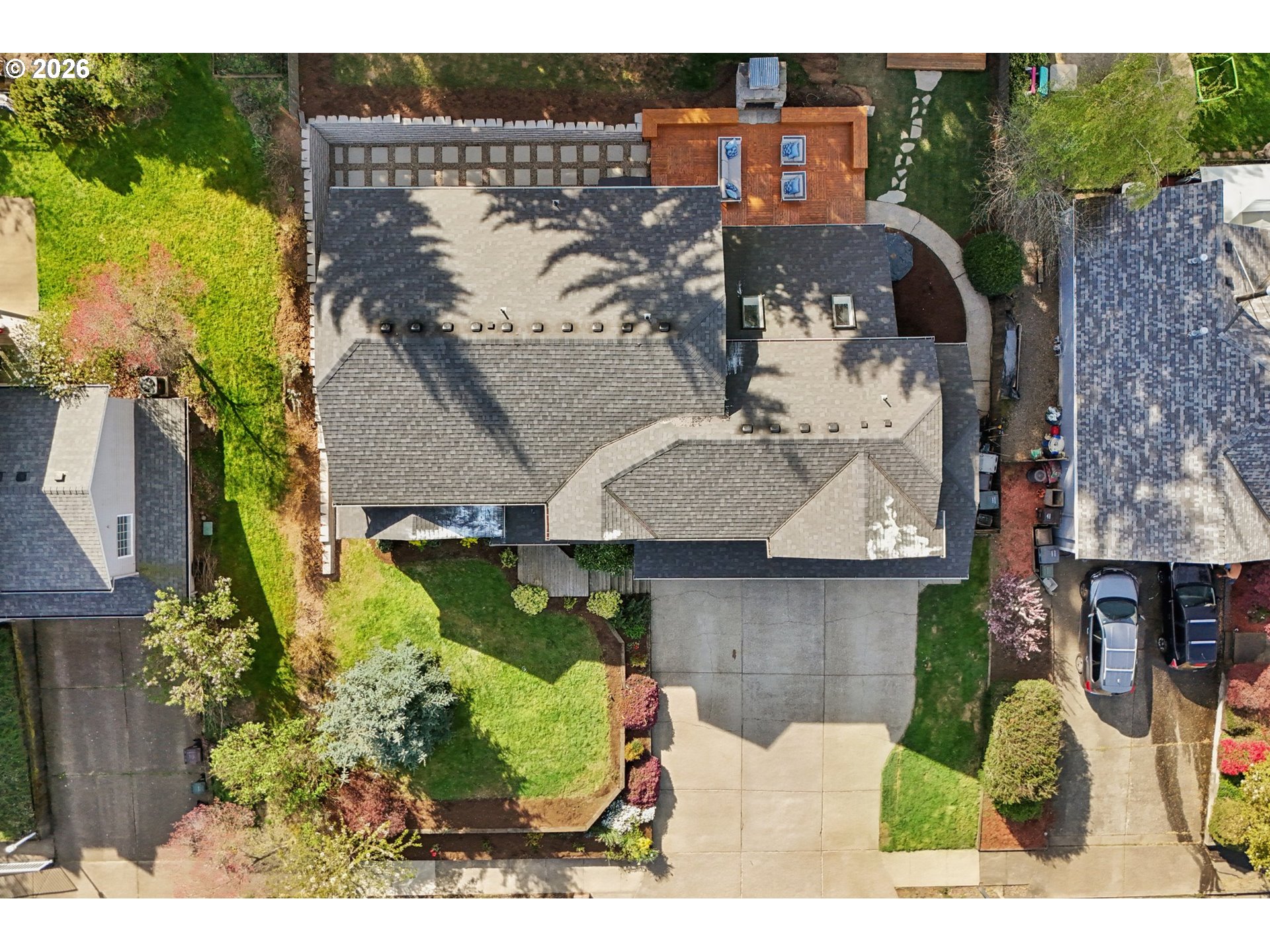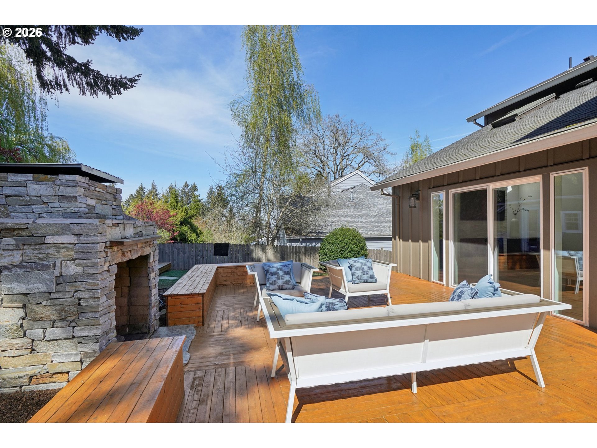 - Fully renovated and better than new, this stunning West Linn home is perfectly situated on nearly a quarter acre on a quiet cul-de-sac in the highly sought-after Rosemont neighborhood with top-rated schools. Offering over 3,000 square feet of thoughtfully designed living space, this rare 5-bedroom home combines modern luxury with everyday functionality. Step inside to an open-concept floor plan with soaring vaulted ceilings, abundant natural light, and brand-new engineered hardwood floors throughout. The dramatic family room is anchored by a striking marble fireplace with custom cabinetry, creating a warm yet sophisticated gathering space. The chef’s kitchen is truly the heart of the home, featuring an oversized island, quartz countertops, stainless steel appliances, and soft-close cabinetry—ideal for entertaining or casual family living.Retreat to the beautifully remodeled primary suite, complete with a spa-like bathroom featuring dual sinks, a new vanity, soaking tub, tiled shower, and designer finishes throughout. Flexible living options allow for all five bedrooms or the ability to convert one into a dedicated office or bonus space. Outdoor living is just as impressive, with a custom parquet cedar deck, outdoor fireplace, and a spacious backyard perfect for play or relaxation. A tastefully finished accessory building offers the ideal work-from-home office or creative studio. Additional highlights include a rare 3-car garage with tall ceilings for exceptional storage, new A/C and gas furnace, new appliances, brand new retaining wall with transferable warranty, skylights, and extensive high-end finishes including tile flooring and quartz and granite surfaces throughout. Located just steps from a neighborhood park and minutes to Wilderness Park, shopping, dining, and top rated schools including West Linn High School, this home offers the perfect blend of luxury, space, and location.