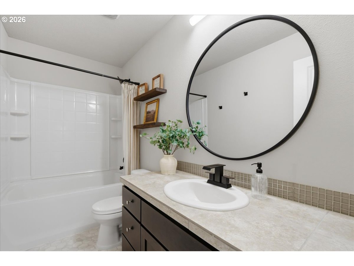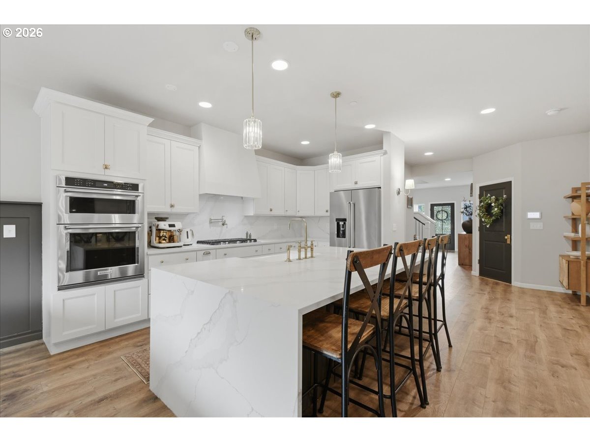 - Fully renovated, this designer home offers the perfect blend of luxury finishes, modern functionality, & everyday convenience. The Chef’s kitchen serves as the centerpiece, featuring quartz countertops, a full-height quartz backsplash, & an oversized 4x8 waterfall-edge island—ideal for entertaining & open-concept living. Custom soft-close cabinetry with built-in storage (including pull-out trash and spice rack) enhances functionality, while a premium KitchenAid appliance package, complete with a 5-burner gas cooktop, built-in convection oven, & microwave, delivers both performance & style. A custom wood range hood, pot filler, farmhouse sink, & unlacquered brass hardware from Rejuvenation complete this elevated space. The open living & dining areas are thoughtfully designed with custom shiplap & board & batten accent walls, complemented by updated designer lighting throughout. A dedicated office or flex space with custom built-ins & a closet provides an ideal work-from-home setup or bedroom room. The fully remodeled downstairs bathroom offers a spa-like retreat with herringbone tile flooring, a modern vanity, dual sconces, & a walk-in shower featuring floor-to-ceiling tile, frameless glass enclosure, rainfall shower head, handheld fixture, & a custom tile mud pan. A high-end toilet with touchless flush & heated seat adds an extra layer of comfort and innovation. Located in the desirable Green Mountain community, residents enjoy access to approximately 14 acres of park space, as well as community amenities including a pool, hot tub, & gathering spaces. Conveniently situated near major freeways, schools, & shopping, this location offers both accessibility & lifestyle appeal. Additional highlights include custom millwork, high-quality materials, & thoughtfully curated finishes throughout. This turnkey home requires no updates & is ideal for buyers seeking a fully upgraded, modern home in a prime Camas location truly better than new construction!