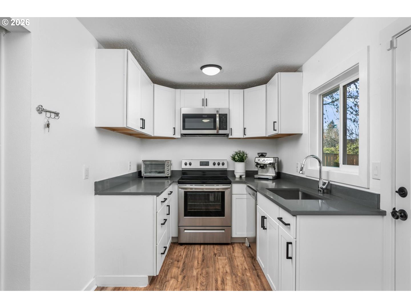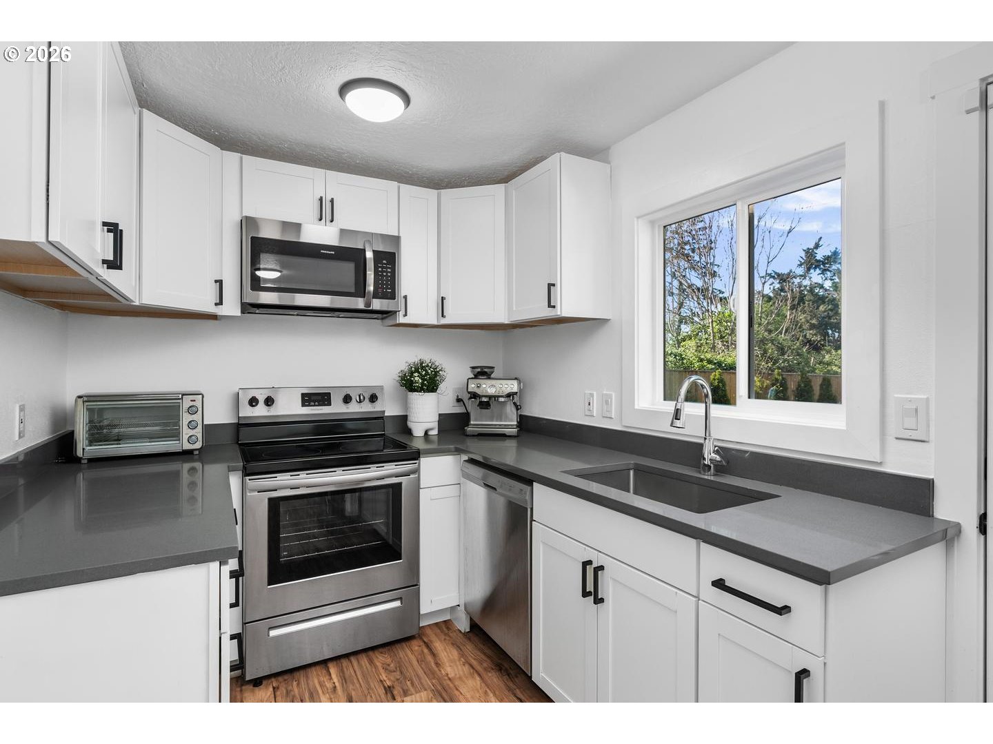 - Step into comfort, privacy, and thoughtful updates—welcome home to 12311 SE Ramona Street. This beautifully refreshed Southeast Portland property offers modern upgrades, flexible living space, and a rare sense of seclusion. Filled with natural light and updates throughout, the home features engineered hardwood floors, plush carpet in the bedrooms, fresh interior and exterior paint, and a fully remodeled 2022 kitchen with quartz countertops, white shaker cabinetry, and stainless-steel appliances.The inviting living room centers around a classic wood-burning fireplace, creating a warm atmosphere for everyday living and cozy evenings. With three spacious bedrooms plus a versatile bonus room, the layout easily adapts to a home office, guest space, or additional lounge area.The updated bathroom showcases clean, modern finishes including a tiled shower, contemporary vanity, new hard wood floor and dual-flush toilet.Step outside to one of the home’s standout features—a huge and private, fully fenced yard with no neighbors to the right or behind, offering peaceful and quiet outdoor space that's rare to find in Portland. The backyard includes 2 big garden beds, a new concrete patio, and fresh landscaping, making it ideal for entertaining, gardening, or simply enjoying the lush and greenery view. Additional upgrades include a new roof (2022), new energy-efficient windows, updated systems, a new electric panel, and a newly poured front patio with modern landscaping and an automatic gate. A spacious driveway provides ample parking for multiple vehicles, adding both convenience and security.Located close to parks, shopping, dining, and commuter routes, this home offers the perfect balance of privacy, updates, and everyday accessibility. Boasting modern improvements, a functional layout, and a unique private setting—this is Southeast Portland living made easy. Don’t miss your opportunity to see it today.