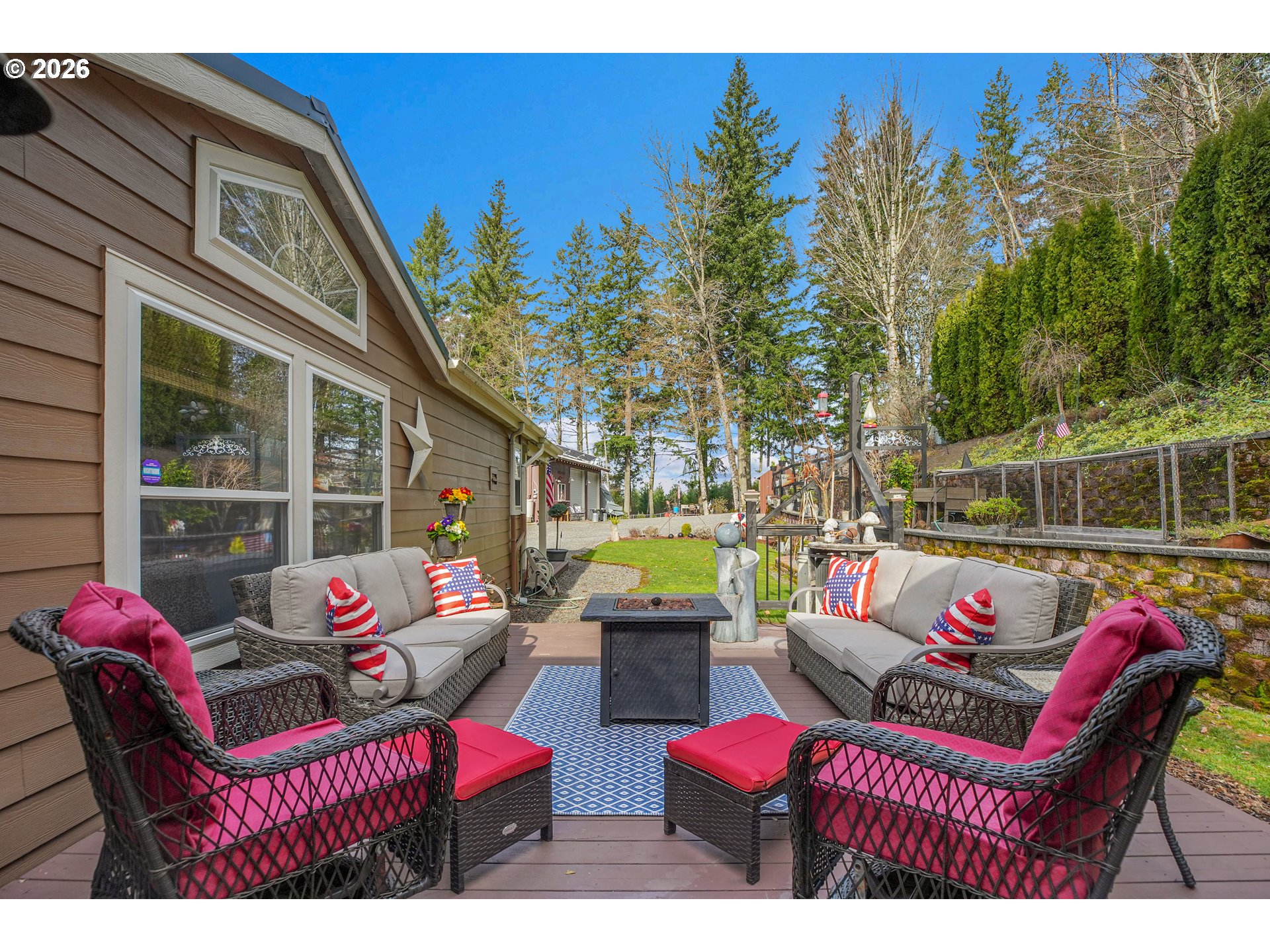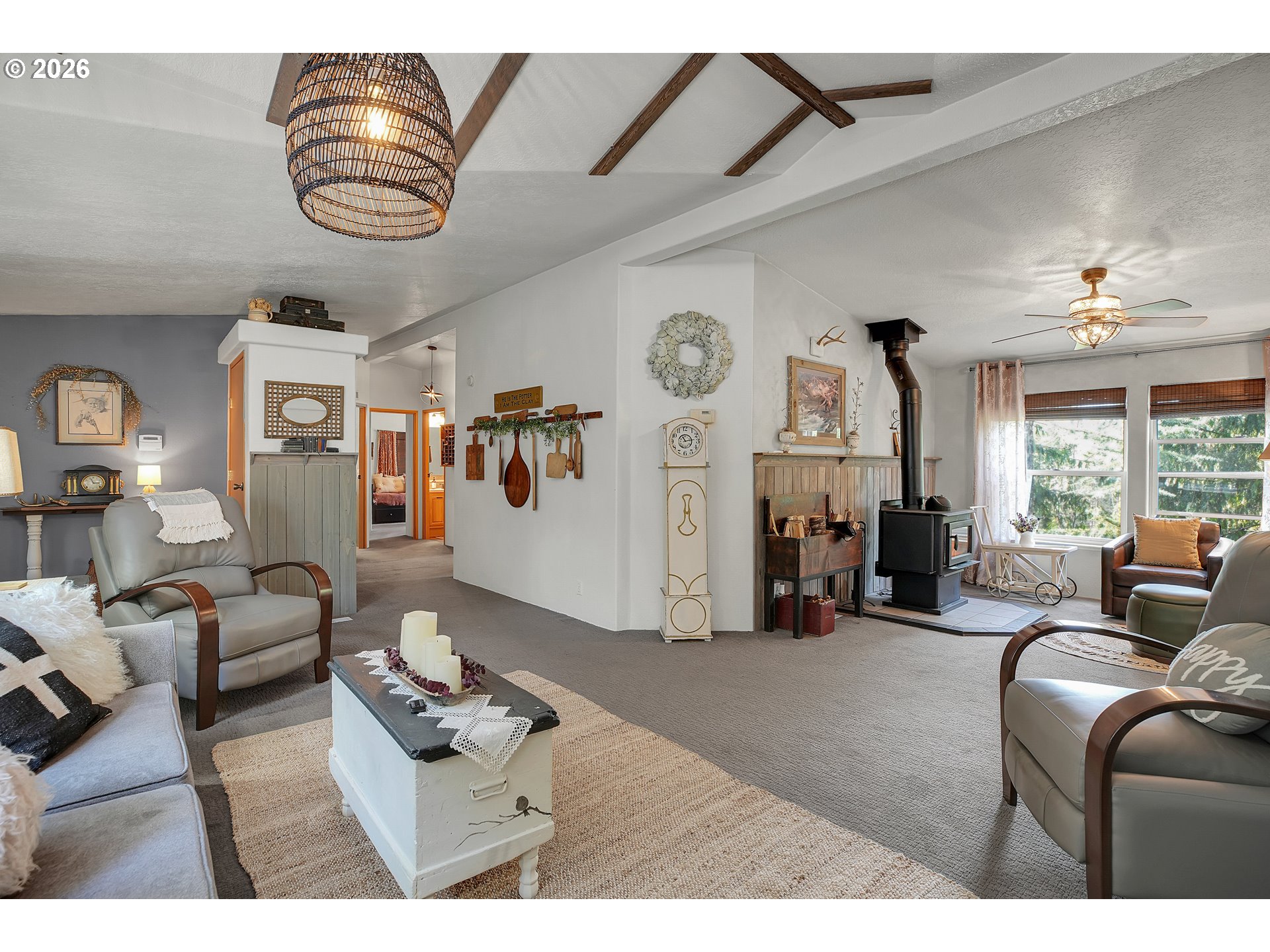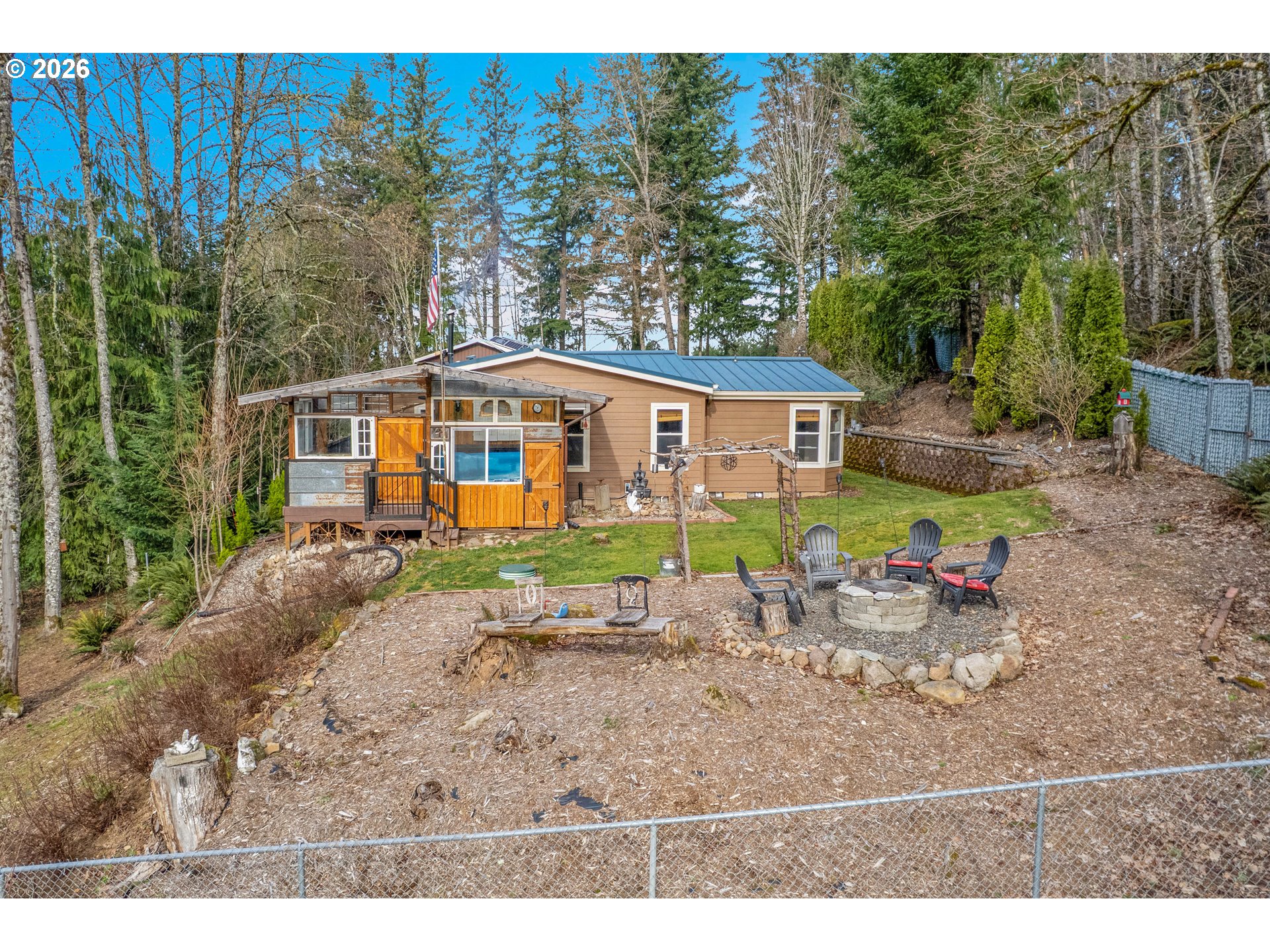 - Set on nearly 4 acres, this beautifully maintained 3-bedroom, 2-bath manufactured home offers over 2000 square feet of comfortable living space. Upon your entry, the expansive great room includes a large kitchen with generous cabinet space, pantry, island, and adjoining dining area — perfect for hosting gatherings. The oversized living room offers vaulted ceilings, large windows, two sitting areas, and a cozy woodstove, creating a warm and welcoming atmosphere.Retreat to the generously sized primary suite, complete with a separate sitting area, walk-in closet, bay windows and a private bath with double sinks and soaking tub. Two additional bedrooms and a full bath provide flexibility for guests, home office, or hobbies.Outside features multiple outdoor spaces to enjoy, including a covered front porch, an open side deck ideal for stargazing, relaxing by the fire, or game nights, and a covered, enclosed area with hot tub for year-round enjoyment. The property also features wonderful gardening areas, room for animals, and expansive open space to make your own.A large shop with two roll-up garage doors offers exceptional storage and workspace, along with ample parking for RVs, boats, and toys. Additional upgrades include solar panels on the garage for energy efficiency and a newer metal roof for long-term durability.This private retreat combines comfort, functionality, and outdoor lifestyle—just minutes from Estacada amenities while offering the tranquility of country living.